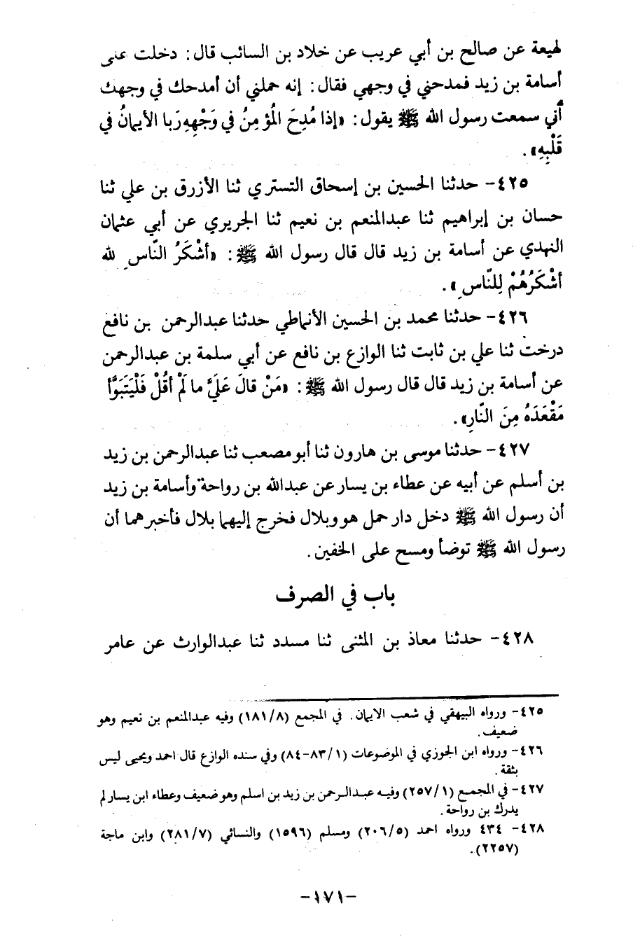 425 - حَدَّثَنَا الْحُسَيْنُ بْنُ إِسْحَاقَ التُّسْتَرِيُّ، ثنا الْأَزْرَقُ بْنُ عَلِيٍّ، ثنا حَسَّانُ بْنُ إِبْرَاهِيمَ، ثنا عَبْدُ الْمُنْعِمِ بْنُ نُعَيْمٍ، ثنا الْجُرَيْرِيُّ، عَنْ أَبِي عُثْمَانَ النَّهْدِيِّ، عَنْ أُسَامَةَ بْنِ زَيْدٍ، قَالَ: قَالَ رَسُولُ اللهِ صَلَّى اللهُ عَلَيْهِ وَسَلَّمَ: «§أَشْكَرُ النَّاسِ لِلَّهِ أَشْكَرُهُمْ لِلنَّاسِ»