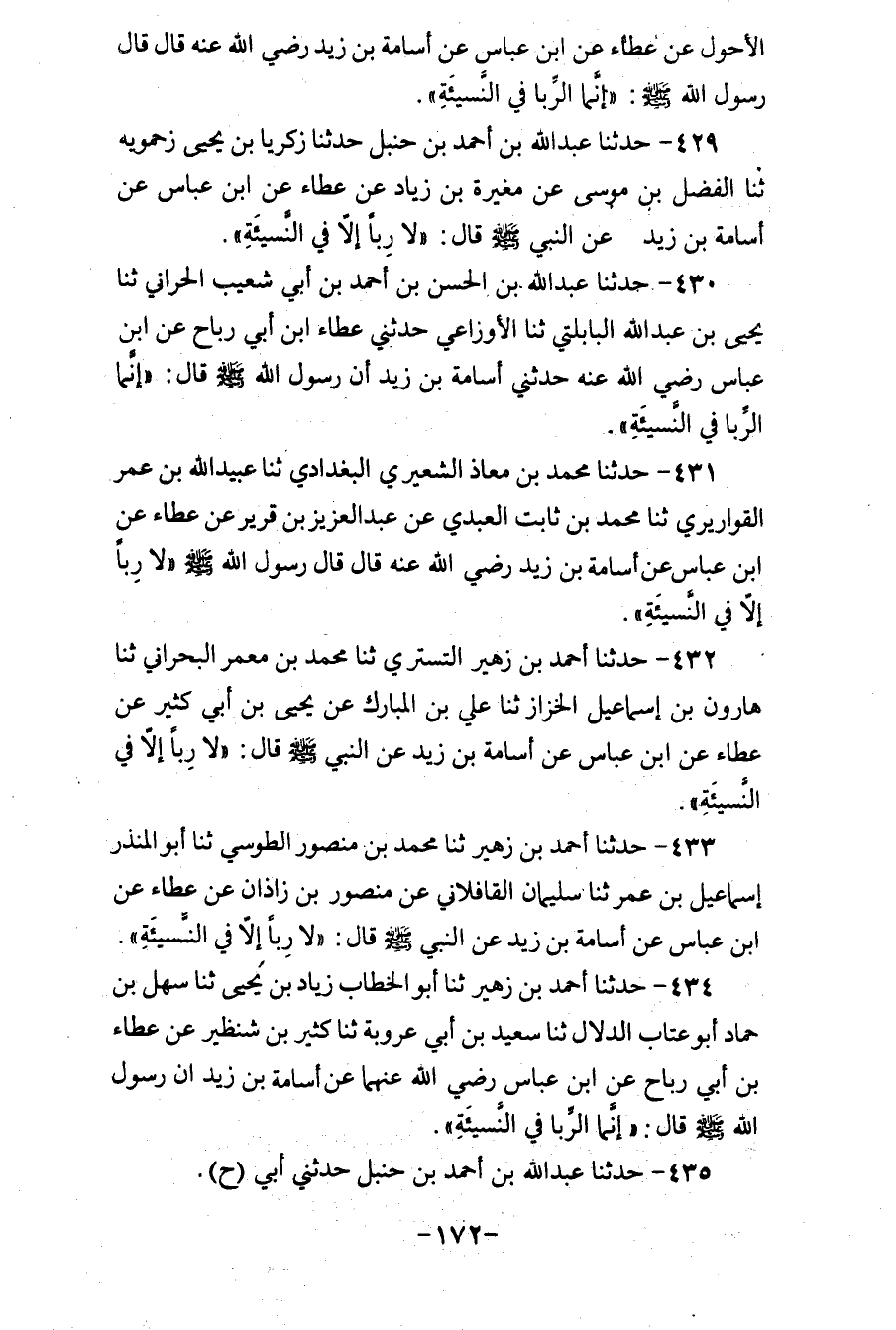 430 - حَدَّثَنَا عَبْدُ اللهِ بْنُ الْحَسَنِ بْنِ أَحْمَدَ بْنِ أَبِي شُعَيْبٍ الْحَرَّانِيُّ، ثنا يَحْيَى بْنُ عَبْدِ اللهِ الْبَابْلُتِيُّ، ثنا الْأَوْزَاعِيُّ، حَدَّثَنِي عَطَاءُ بْنُ أَبِي رَبَاحٍ، عَنِ ابْنِ عَبَّاسٍ رَضِيَ اللهُ عَنْهُ، حَدَّثَنِي أُسَامَةُ بْنُ زَيْدٍ، أَنَّ رَسُولَ اللهِ صَلَّى اللهُ عَلَيْهِ وَسَلَّمَ قَالَ: «إِنَّمَا §الرِّبَا فِي النَّسِيئَةِ»