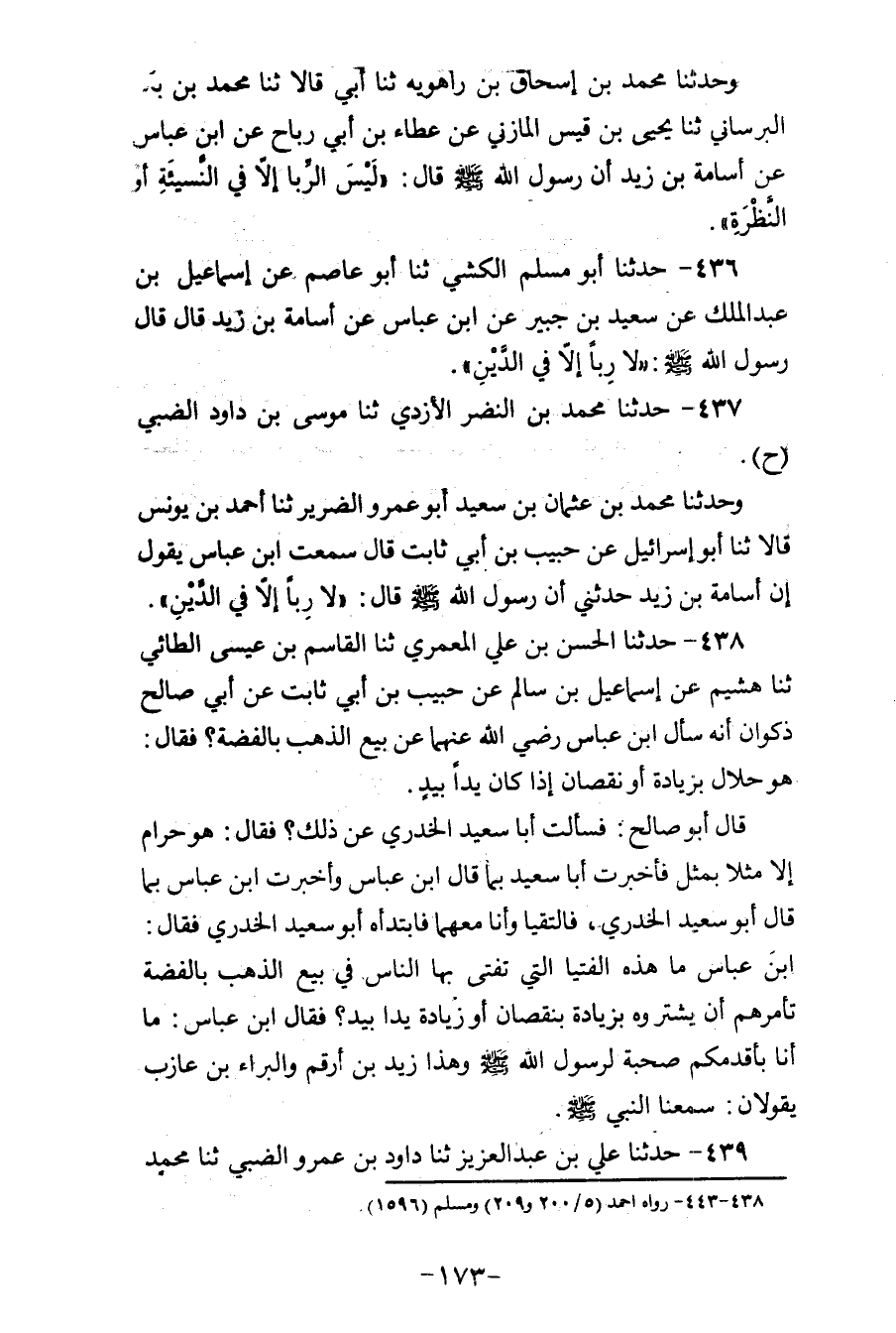 439 - حَدَّثَنَا عَلِيُّ بْنُ عَبْدِ الْعَزِيزِ، ثنا دَاوُدُ بْنُ عَمْرٍو الضَّبِّيُّ، ثنا مُحَمَّدُ بْنُ مُسْلِمٍ، عَنْ عَمْرِو بْنِ دِينَارٍ، عَنْ ذَكْوَانَ أَبِي صَالِحٍ، عَنِ ابْنِ عَبَّاسٍ، قَالَ: حَدَّثَنِي أُسَامَةُ بْنُ زَيْدٍ، أَنَّ رَسُولَ اللهِ صَلَّى اللهُ عَلَيْهِ وَسَلَّمَ قَالَ: «§الرِّبَا فِي النَّسِيئَةِ»