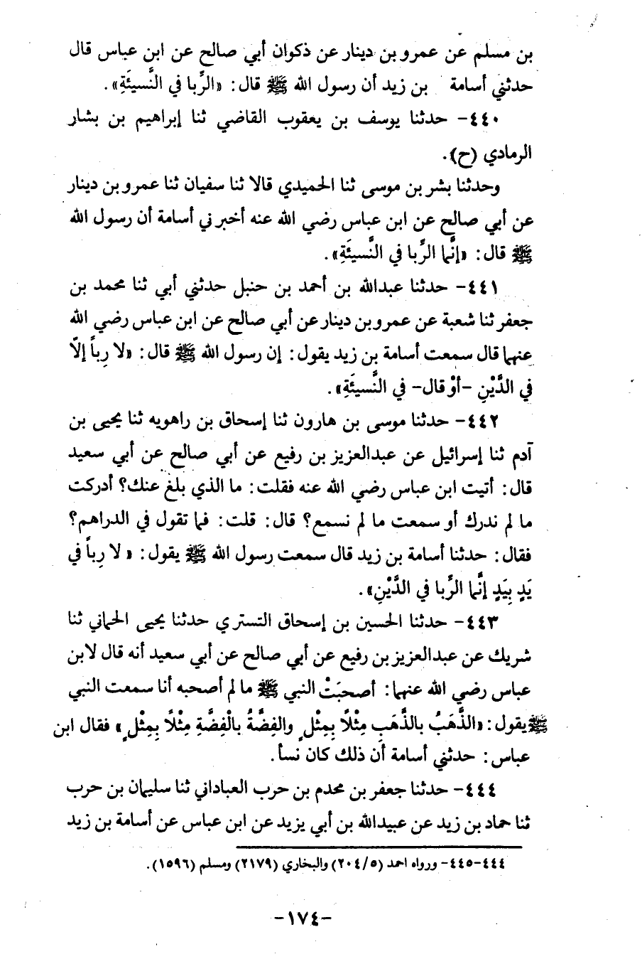 440 - حَدَّثَنَا يُوسُفُ بْنُ يَعْقُوبَ الْقَاضِي، ثنا إِبْرَاهِيمُ بْنُ بَشَّارٍ الرَّمَادِيُّ، ح وَحَدَّثَنَا بِشْرُ بْنُ مُوسَى، ثنا الْحُمَيْدِيُّ، قَالَا: ثنا سُفْيَانُ، ثنا عَمْرُو بْنُ دِينَارٍ، عَنْ أَبِي صَالِحٍ، عَنِ ابْنِ عَبَّاسٍ رَضِيَ اللهُ عَنْهُ، أَخْبَرَنِي أُسَامَةُ، أَنَّ رَسُولَ اللهِ صَلَّى اللهُ عَلَيْهِ وَسَلَّمَ قَالَ: «إِنَّمَا §الرِّبَا فِي النَّسِيئَةِ»