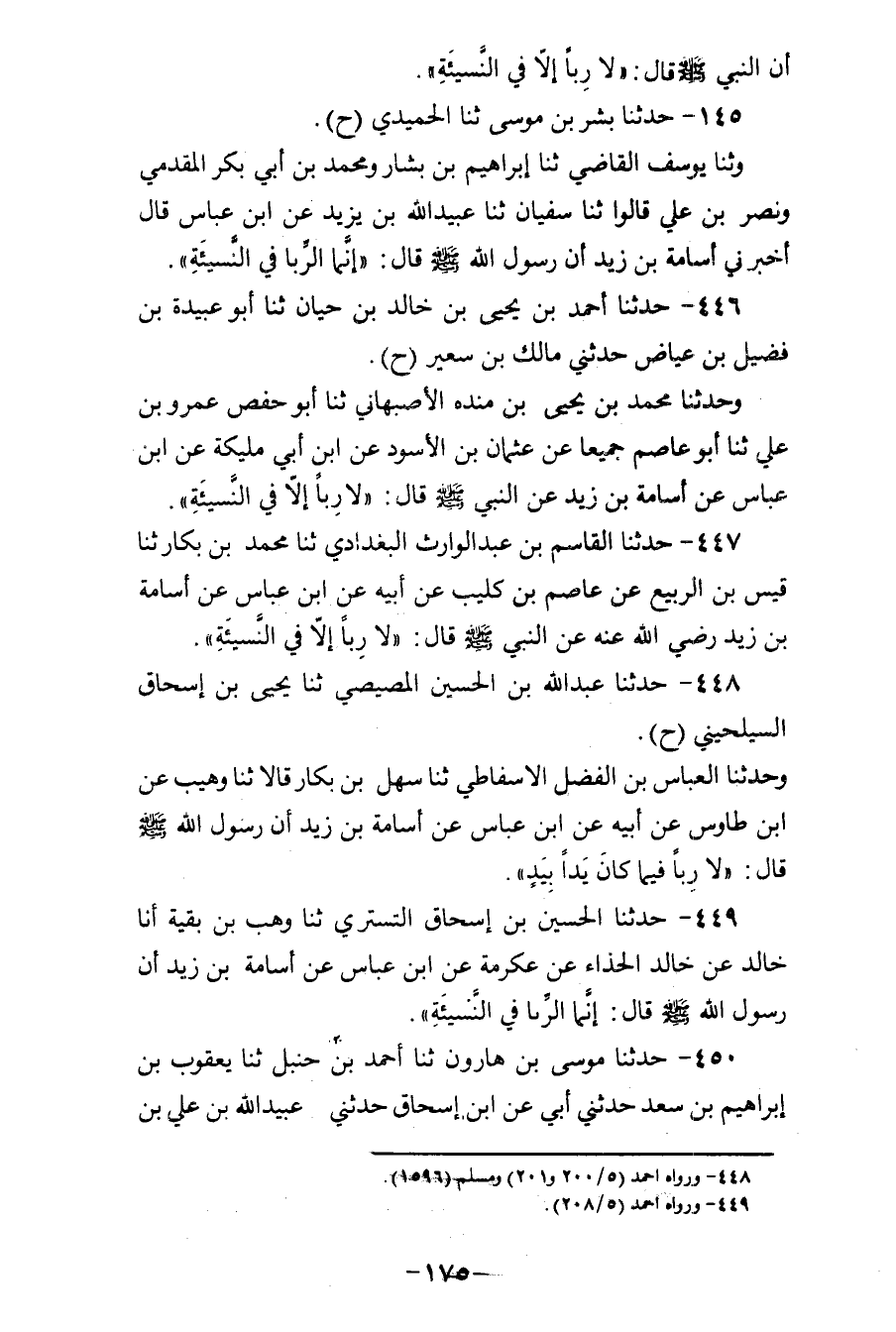 445 - حَدَّثَنَا بِشْرُ بْنُ مُوسَى، ثنا الْحُمَيْدِيُّ، ح وَثَنَا يُوسُفُ الْقَاضِي، ثنا إِبْرَاهِيمُ بْنُ بَشَّارٍ، وَمُحَمَّدُ بْنُ أَبِي بَكْرٍ الْمُقَدَّمِيُّ، وَنَصْرُ بْنُ عَلِيٍّ، قَالُوا: ثنا سُفْيَانُ، ثنا عُبَيْدُ اللهِ بْنُ يَزِيدَ، عَنِ ابْنِ عَبَّاسٍ، قَالَ: أَخْبَرَنِي أُسَامَةُ بْنُ زَيْدٍ، أَنَّ رَسُولَ اللهِ صَلَّى اللهُ عَلَيْهِ وَسَلَّمَ قَالَ: «إِنَّمَا §الرِّبَا فِي النَّسِيئَةِ»