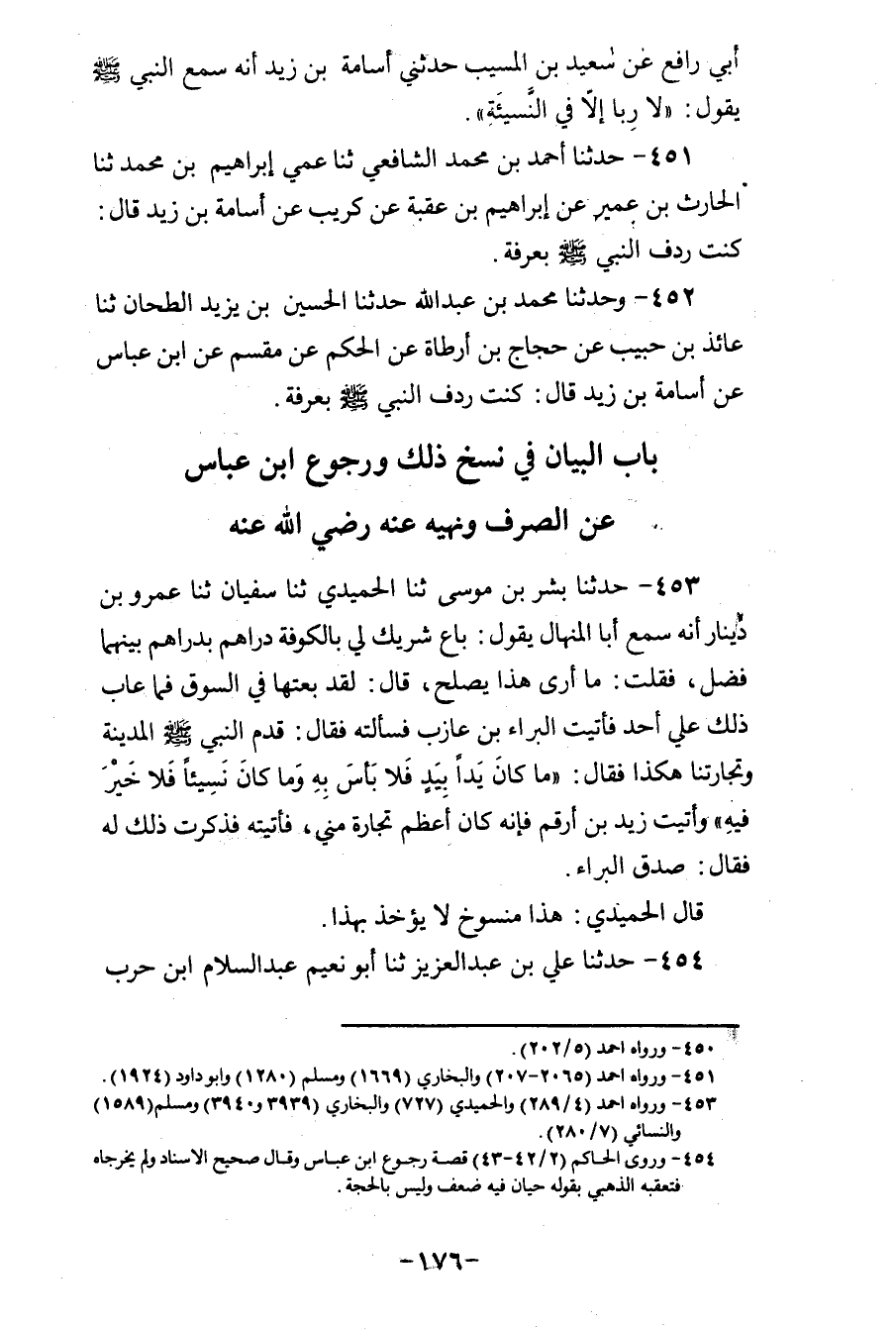 453 - حَدَّثَنَا بِشْرُ بْنُ مُوسَى، ثنا الْحُمَيْدِيُّ، ثنا سُفْيَانُ، ثنا عَمْرُو بْنُ دِينَارٍ، أَنَّهُ مَعَ أَبِي الْمِنْهَالِ يَقُولُ: بَاعَ شَرِيكٌ لِي بِالْكُوفَةِ دَرَاهِمَ بِدَرَاهِمَ بَيْنَهُمَا فَضْلٌ، فَقُلْتُ: مَا أَرَى هَذَا يَصْلُحُ. قَالَ: لَقَدْ بِعْتُهَا فِي السُّوقِ فَمَا عَابَ ذَلِكَ عَلَيَّ أَحَدٌ، فَأَتَيْتُ الْبَرَاءَ بْنَ عَازِبٍ فَسَأَلْتُهُ فَقَالَ: قَدِمَ النَّبِيُّ صَلَّى اللهُ عَلَيْهِ وَسَلَّمَ الْمَدِينَةَ وَتِجَارَتُنَا هَكَذَا، فَقَالَ: «§مَا كَانَ يَدًا بِيَدٍ فَلَا بَأْسَ بِهِ، وَمَا كَانَ نَسِيئًا فَلَا خَيْرَ فِيهِ» وَأَتَيْتُ زَيْدَ بْنَ أَرْقَمَ، فَإِنَّهُ أَعْظَمُ تِجَارَةً مِنِّي فَأَتَيْتُهُ، فَذَكَرْتُ ذَلِكَ لَهُ فَقَالَ: صَدَقَ الْبَرَاءُ قَالَ الْحُمَيْدِيُّ: «هَذَا مَنْسُوخٌ لَا يُأْخَذُ بِهَذَا»