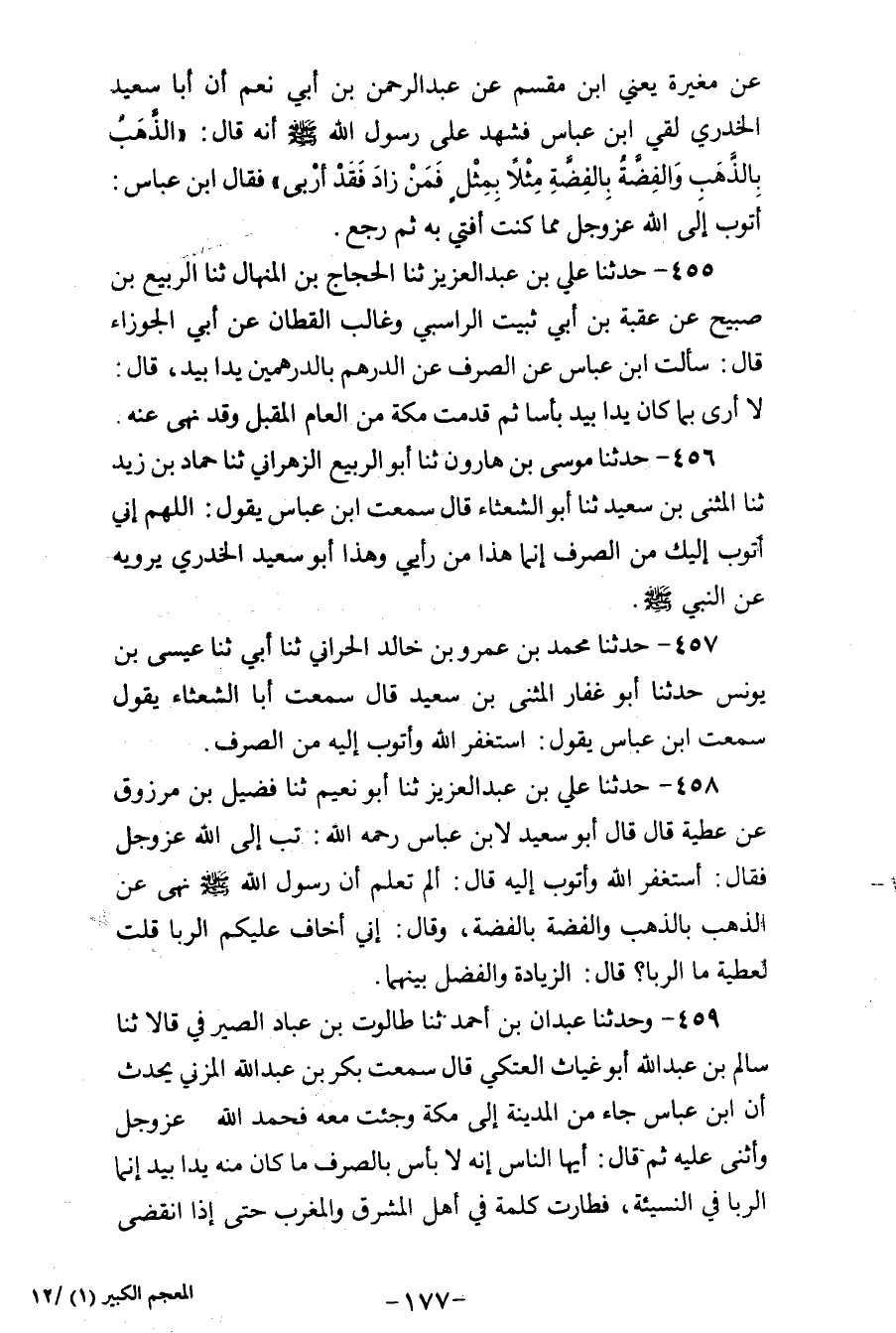 456 - حَدَّثَنَا مُوسَى بْنُ هَارُونَ، ثنا أَبُو الرَّبِيعِ الزَّهْرَانِيُّ، ثنا حَمَّادُ بْنُ زَيْدٍ، ثنا الْمُثَنَّى بْنُ سَعِيدٍ، ثنا أَبُو الشَّعْثَاءِ، قَالَ: سَمِعْتُ ابْنَ عَبَّاسٍ، يَقُولُ: «§اللهُمَّ إِنِّي أَتُوبُ إِلَيْكَ مِنَ الصَّرْفِ، إِنَّمَا هَذَا مِنْ رَأْيِي وَهَذَا أَبُو سَعِيدٍ الْخُدْرِيُّ يَرْوِيهِ عَنِ النَّبِيِّ صَلَّى الله عَلَيْهِ وَسَلَّمً»