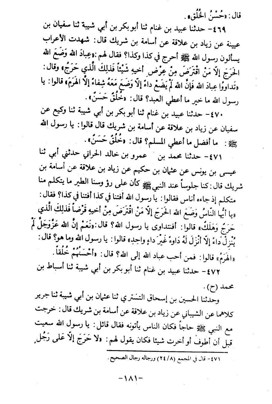469 - حَدَّثَنَا عُبَيْدُ بْنُ غَنَّامٍ، ثنا أَبُو بَكْرِ بْنُ أَبِي شَيْبَةَ، ثنا سُفْيَانُ بْنُ عُيَيْنَةَ، عَنْ زِيَادِ بْنِ عِلَاقَةَ، عَنْ أُسَامَةَ بْنِ شَرِيكٍ، قَالَ: شَهِدْتُ الْأَعْرَابَ يَسْأَلُونَ رَسُولَ اللهِ صَلَّى اللهُ عَلَيْهِ وَسَلَّمَ: أَحَرَجٌ فِي كَذَا وَكَذَا؟ فَقَالَ لَهُمْ: " عِبَادَ اللهِ، §وَضَعَ اللهُ الْحَرَجَ إِلَّا مَنِ اقْتَرَضَ مِنْ عِرْضِ أَخِيهِ شَيْئًا، فَذَلِكَ الَّذِي حَرَجَ، وَقَالَ: " تَدَاوَوْا عِبَادَ اللهِ، فَإِنَّ اللهَ لَمْ يَضَعْ دَاءً إِلَّا وَضَعَ مَعَهُ شِفَاءً إِلَّا الْهَرَمَ، يَا رَسُولَ اللهِ مَا خَيْرُ مَا أُعْطِيَ الْعَبْدُ قَالَ: «خُلُقٌ حَسَنٌ»