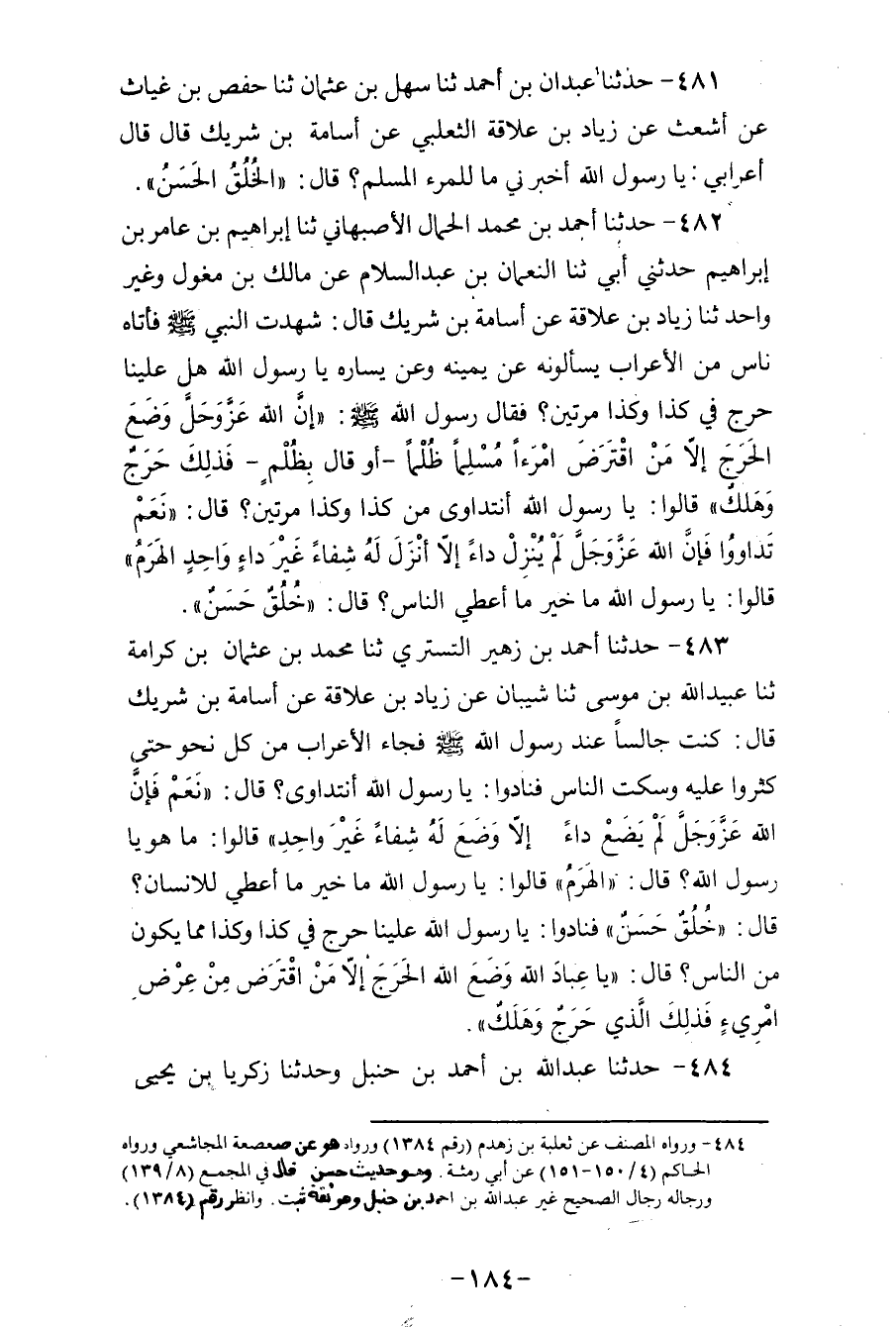 483 - حَدَّثَنَا أَحْمَدُ بْنُ زُهَيْرٍ التُّسْتَرِيُّ، ثنا مُحَمَّدُ بْنُ عُثْمَانَ بْنِ كَرَامَةَ، ثنا عُبَيْدُ اللهِ بْنُ مُوسَى، ثنا شَيْبَانُ، عَنْ زِيَادِ بْنِ عِلَاقَةَ، عَنْ أُسَامَةَ بْنِ شَرِيكٍ، قَالَ: كُنْتُ جَالِسًا عِنْدَ رَسُولِ اللهِ صَلَّى اللهُ عَلَيْهِ وَسَلَّمَ، فَجَاءَ الْأَعْرَابُ مِنْ كُلِّ نَحْوٍ حَتَّى كَثُرُوا عَلَيْهِ، وَسَكَتَ النَّاسُ، فَنَادَوْا: يَا رَسُولَ اللهِ، أَنَتَدَاوَى؟ قَالَ: «نَعَمْ، فَإِنَّ §اللهَ عَزَّ وَجَلَّ لَمْ يَضَعْ دَاءً إِلَّا وَضَعَ لَهُ شِفَاءً غَيْرَ وَاحِدٍ» قَالُوا: مَا هُوَ يَا رَسُولَ اللهِ؟ قَالَ: " الْهَرَمُ، قَالُوا: يَا رَسُولَ اللهِ، مَا خَيْرُ مَا أُعْطِيَ لِلْإِنْسَانُ؟ قَالَ: " خُلُقٌ حَسَنٌ، فَنَادَوْا: يَا رَسُولَ اللهِ عَلَيْنَا حَرَجٌ فِي كَذَا وَكَذَا؟ مِمَّا يَكُونُ مِنَ النَّاسِ، قَالَ: «يَا عِبَادَ اللهِ، وَضَعَ اللهُ الْحَرَجَ إِلَّا مَنِ اقْتَرَضَ مِنْ عِرْضٍ امْرِئٍ فَذَلِكَ الَّذِي حَرِجَ وَهَلَكَ»