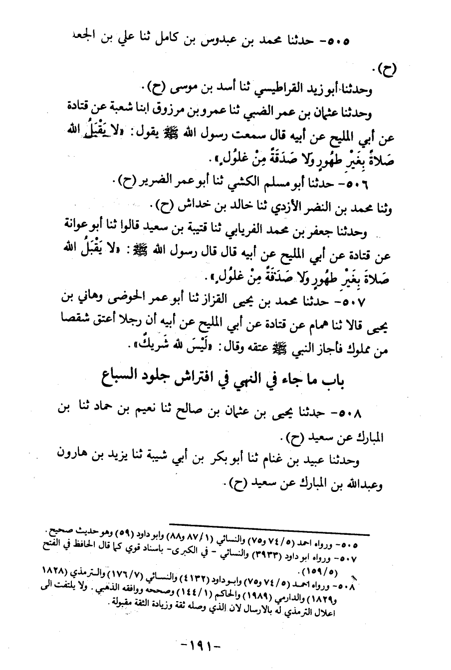 508 - حَدَّثَنَا يَحْيَى بْنُ عُثْمَانَ بْنِ صَالِحٍ، ثنا نُعَيْمُ بْنُ حَمَّادٍ، ثنا ابْنُ الْمُبَارَكِ، عَنْ سَعِيدٍ، ح وَحَدَّثَنَا عُبَيْدُ بْنُ غَنَّامٍ، ثنا أَبُو بَكْرِ بْنُ أَبِي شَيْبَةَ، ثنا يَزِيدُ بْنُ هَارُونَ، وَعَبْدُ اللهِ بْنُ الْمُبَارَكِ، عَنْ سَعِيدٍ، ح وَحَدَّثَنَا مُعَاذُ بْنُ الْمُثَنَّى، ثنا مُسَدَّدٌ، ثنا يَحْيَى بْنُ سَعِيدٍ، عَنْ سَعِيدِ بْنِ أَبِي عَرُوبَةَ، عَنْ قَتَادَةَ، عَنْ أَبِي الْمَلِيحِ، عَنْ أَبِيهِ، «أَنَّ رَسُولَ اللهِ صَلَّى اللهُ عَلَيْهِ وَسَلَّمَ §نَهَى عَنْ جُلُودِ السِّبَاعِ» زَادَ يَزِيدُ بْنُ هَارُونَ: «أَنْ تُفْتَرَشَ»