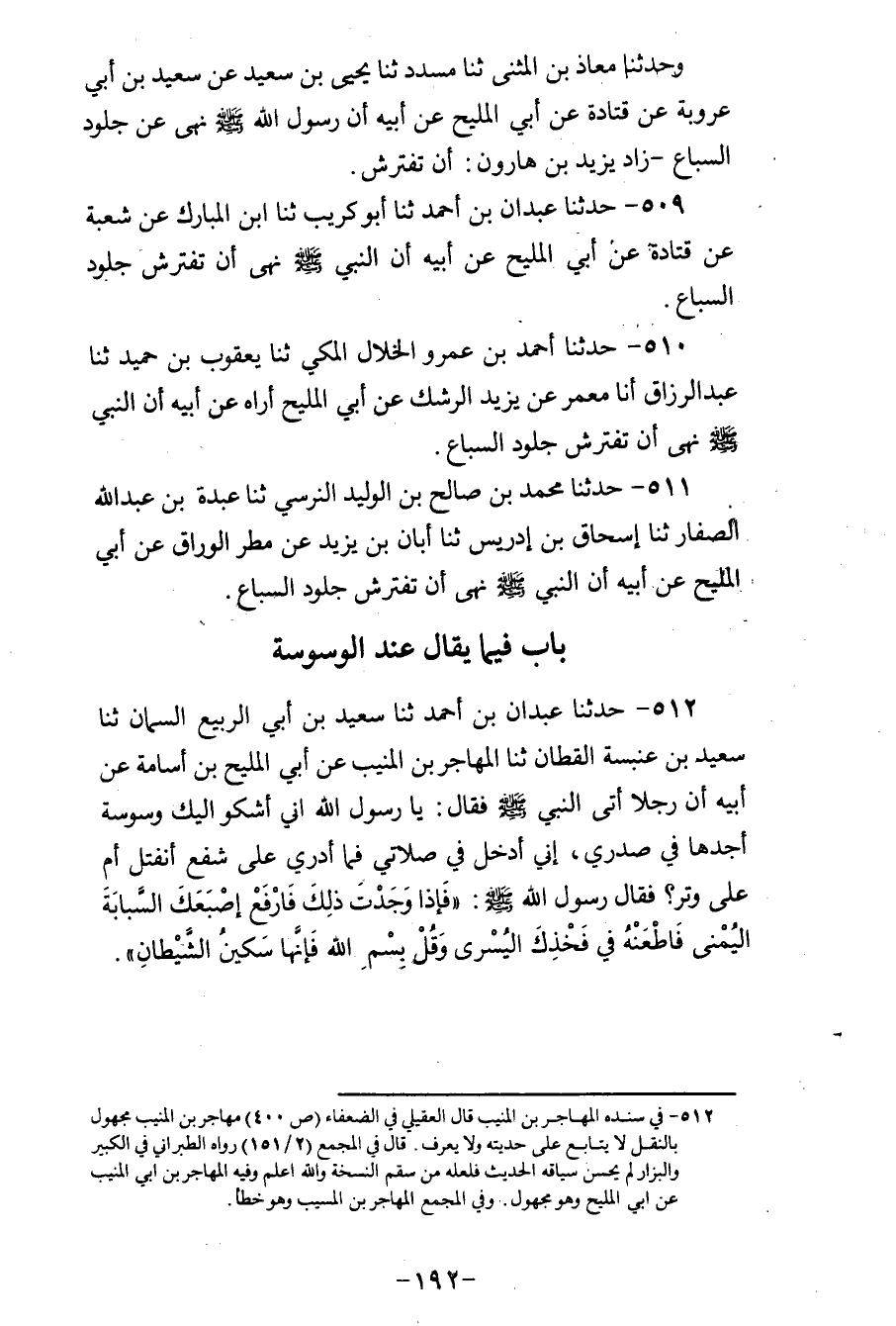 512 - حَدَّثَنَا عَبْدَانُ بْنُ أَحْمَدَ، ثنا سَعِيدُ بْنُ أَبِي الرَّبِيعِ السَّمَّانُ، ثنا سَعِيدُ بْنُ عَنْبَسَةَ الْقَطَّانُ، ثنا الْمُهَاجِرُ بْنُ الْمُنِيبِ، عَنْ أَبِي الْمَلِيحِ بْنِ أُسَامَةَ، عَنْ أَبِيهِ، أَنَّ رَجُلًا، أَتَى النَّبِيَّ صَلَّى اللهُ عَلَيْهِ وَسَلَّمَ، فَقَالَ: يَا رَسُولَ اللهِ، إِنِّي أَشْكُو إِلَيْكَ وَسْوَسَةً أَجِدُهَا فِي صَدْرِي، إِنِّي أَدْخُلُ فِي صَلَاتِي فَمَا أَدْرِي عَلَى شَفْعٍ أنْفَتِلُ، أَمْ عَلَى وِتْرٍ؟ فَقَالَ رَسُولُ اللهِ صَلَّى اللهُ عَلَيْهِ وَسَلَّمَ: " فَإِذَا وَجَدْتَ ذَلِكَ §فَارْفَعْ إِصْبَعَكَ السَّبَّابَةَ الْيُمْنَى فَاطْعَنْهُ فِي فَخِذِكَ الْيُسْرَى، وَقُلْ: بِسْمِ اللهِ، فَإِنَّهَا سِكِّينُ الشَّيْطَانِ "