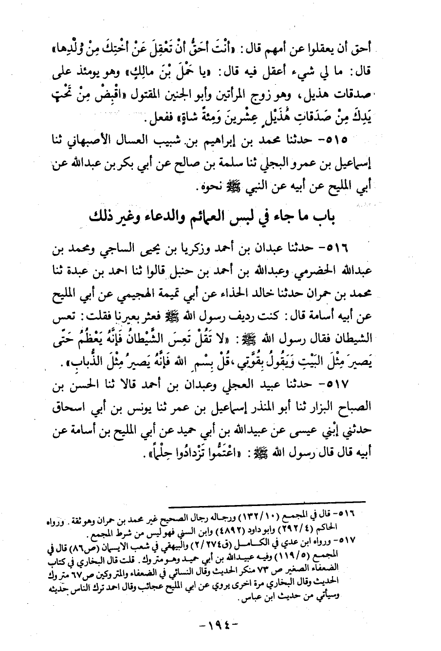 516 - حَدَّثَنَا عَبْدَانُ بْنُ أَحْمَدَ، وَزَكَرِيَّا بْنُ يَحْيَى السَّاجِيُّ، وَمُحَمَّدُ بْنُ عَبْدِ اللهِ الْحَضْرَمِيُّ، وَعَبْدُ اللهِ بْنُ أَحْمَدَ بْنِ حَنْبَلٍ، قَالُوا: ثنا أَحْمَدُ بْنُ عَبْدَةَ، ثنا مُحَمَّدُ بْنُ حُمْرَانَ، حَدَّثَنَا خَالِدٌ الْحَذَّاءُ، عَنْ أَبِي تَمِيمَةَ الْهُجَيْمِيِّ، عَنْ أَبِي الْمَلِيحِ، عَنْ أَبِيهِ أُسَامَةَ قَالَ: كُنْتُ رَدِيفَ رَسُولِ اللهِ صَلَّى اللهُ عَلَيْهِ وَسَلَّمَ فَعَثَرَ بَعِيرُنَا، فَقُلْتُ: تَعِسَ الشَّيْطَانُ، فَقَالَ رَسُولُ اللهِ صَلَّى اللهُ عَلَيْهِ وَسَلَّمَ: " §لَا تَقُلْ: تَعِسَ الشَّيْطَانُ، فَإِنَّهُ يَعْظُمُ حَتَّى يَصِيرَ مِثْلَ الْبَيْتِ، وَيَقُولَ: بِقُوَّتِي، قُلْ: بِسْمِ اللهِ، فَإِنَّهُ يَصِيرُ مِثْلَ الذُّبَابِ "