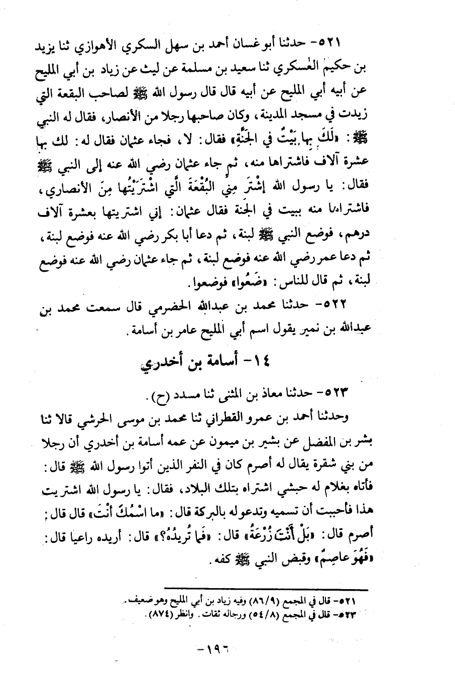 521 - حَدَّثَنَا أَبُو غَسَّانَ أَحْمَدُ بْنُ سَهْلٍ السُّكَّرِيُّ الْأَهْوَازِيُّ، ثنا يَزِيدُ بْنُ حَكِيمٍ الْعَسْكَرِيُّ، ثنا سَعِيدُ بْنُ مَسْلَمَةَ، عَنْ لَيْثٍ، عَنْ زِيَادِ بْنِ أَبِي الْمَلِيحِ، عَنْ أَبِيهِ أَبِي الْمَلِيحِ، عَنْ أَبِيهِ، قَالَ: قَالَ رَسُولُ اللهِ صَلَّى اللهُ عَلَيْهِ وَسَلَّمَ لِصَاحِبِ الْبُقْعَةِ الَّتِي زِيدَتْ فِي مَسْجِدِ الْمَدِينَةِ، وَكَانَ صَاحِبُهَا رَجُلًا مِنَ الْأَنْصَارِ، فَقَالَ لَهُ النَّبِيُّ صَلَّى اللهُ عَلَيْهِ وَسَلَّمَ: «§لَكَ بِهَا بَيْتٌ فِي الْجَنَّةِ» . فَقَالَ: فَجَاءَ عُثْمَانُ فَقَالَ لَهُ: لَكَ بِهَا عَشْرَةُ آلَافٍ فَاشْتَرَاهَا مِنْهُ، ثُمَّ جَاءَ عُثْمَانُ رَضِيَ اللهُ عَنْهُ إِلَى النَّبِيِّ صَلَّى اللهُ عَلَيْهِ وَسَلَّمَ، فَقَالَ: يَا رَسُولَ اللهِ، اشْتَرِ مِنِّي الْبُقْعَةَ الَّتِي اشْتَرَيْتُهَا مِنَ الْأَنْصَارِيِّ، فَاشْتَرَاهَا مِنْهُ بِبَيْتٍ فِي الْجَنَّةِ. فَقَالَ عُثْمَانُ: إِنِّي اشْتَرَيْتُهَا بِعَشَرَةِ آلَافِ دِرْهَمٍ، فَوَضَعَ النَّبِيُّ صَلَّى اللهُ عَلَيْهِ وَسَلَّمَ لَبِنَةً، ثُمَّ دَعَا أَبَا بَكْرٍ رَضِيَ اللهُ عَنْهُ، فَوَضَعَ لَبِنَةً، ثُمَّ دَعَا عُمَرَ رَضِيَ اللهُ عَنْهُ، فَوَضَعَ لَبِنَةً، ثُمَّ جَاءَ عُثْمَانُ رَضِيَ اللهُ عَنْهُ، فَوَضَعَ لَبِنَةً، ثُمَّ قَالَ لِلنَّاسِ: «ضَعُوا» فَوَضَعُوا