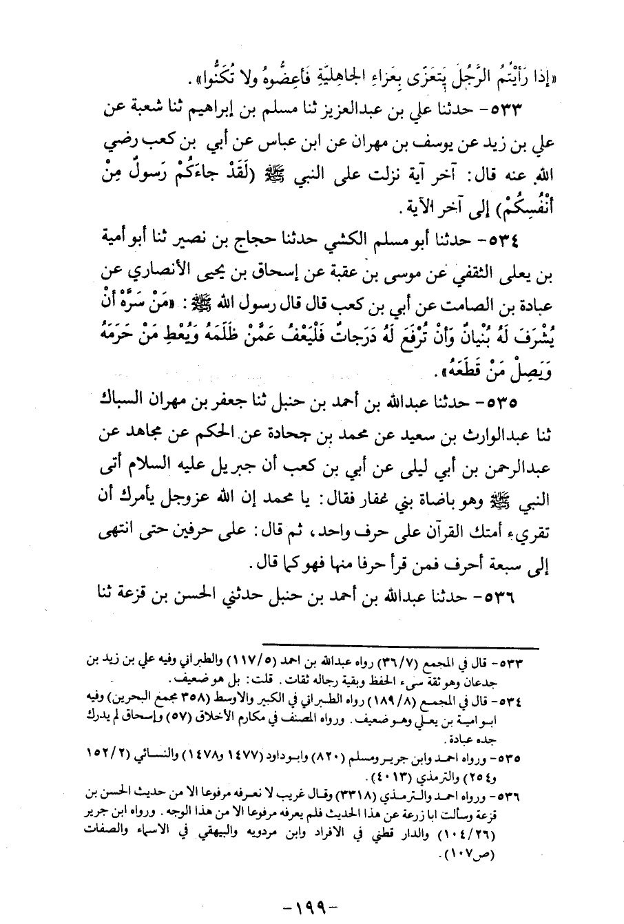 535 - حَدَّثَنَا عَبْدُ اللهِ بْنُ أَحْمَدَ بْنِ حَنْبَلٍ، ثنا جَعْفَرُ بْنُ مِهْرَانَ السَّبَّاكُ، ثنا عَبْدُ الْوَارِثِ بْنُ سَعِيدٍ، عَنْ مُحَمَّدِ بْنِ جُحَادَةَ، عَنِ الْحَكَمِ، عَنْ مُجَاهِدٍ، عَنْ عَبْدِ الرَّحْمَنِ بْنِ أَبِي لَيْلَى، عَنْ أُبَيِّ بْنِ كَعْبٍ " أَنَّ جِبْرِيلَ عَلَيْهِ السَّلَامُ أَتَى النَّبِيَّ صَلَّى اللهُ عَلَيْهِ وَسَلَّمَ: وَهُوَ بِأَضَاةِ بَنِي غِفَارٍ فَقَالَ: يَا مُحَمَّدُ، إِنَّ §اللهَ عَزَّ وَجَلَّ يَأْمُرُكَ أَنْ تُقْرِئَ أُمَّتَكَ الْقُرْآنَ عَلَى حَرْفٍ وَاحِدٍ، ثُمَّ قَالَ: عَلَى حَرْفَيْنِ حَتَّى انْتَهَى إِلَى سَبْعَةِ أَحْرُفٍ، فَمَنْ قَرَأَ حَرْفًا مِنْهَا فَهُوَ كَمَا قَالَ "