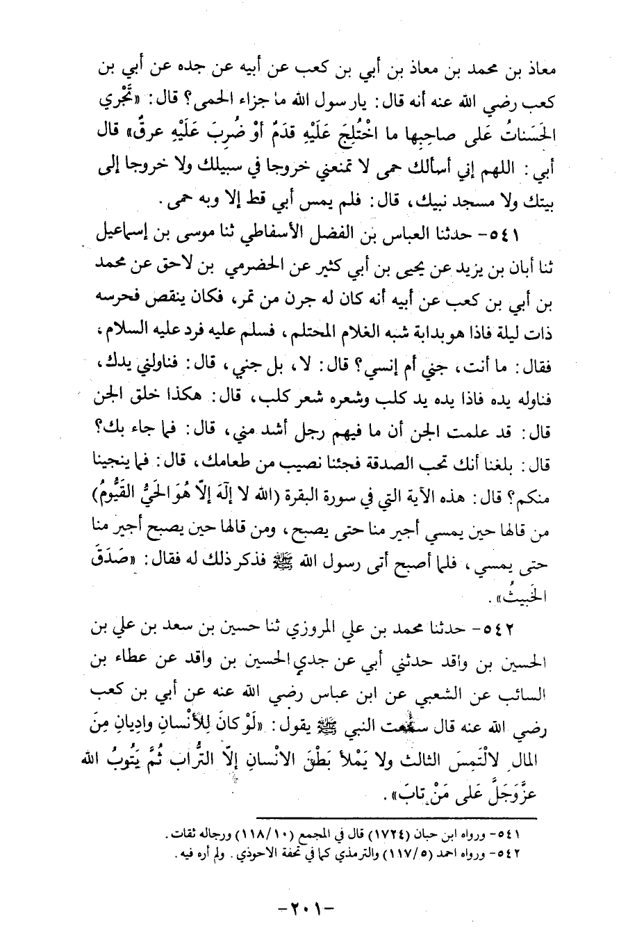 541 - حَدَّثَنَا الْعَبَّاسُ بْنُ الْفَضْلِ الْأَسْفَاطِيُّ، ثنا مُوسَى بْنُ إِسْمَاعِيلَ، ثنا أَبَانُ بْنُ يَزِيدَ، عَنْ يَحْيَى بْنِ أَبِي كَثِيرٍ، عَنِ الْحَضْرَمِيِّ بْنِ لَاحِقٍ، عَنْ مُحَمَّدِ بْنِ أُبَيِّ بْنِ كَعْبٍ، عَنْ أَبِيهِ، أَنَّهُ كَانَ لَهُ جُرْنٌ مِنْ تَمْرٍ، فَكَانَ يَنْقُصُ، فَحَرَسَهُ ذَاتَ لَيْلَةٍ، فَإِذَا هُوَ بِدَابَّةٍ شِبْهِ الْغُلَامِ الْمُحْتَلِمِ، فَسَلَّمَ عَلَيْهِ، فَرَدَّ عَلَيْهِ السَّلَامَ، فَقَالَ: مَا أَنْتَ، جِنِّيٌّ أَمْ إِنْسِيٌّ؟ قَالَ: لَا بَلْ جِنِّيٌّ. قَالَ: فَنَاوِلْنِي يَدَكَ. فَنَاوَلَهُ يَدَهُ، فَإِذَا يَدُهُ يَدُ كَلْبٍ، وَشَعْرُهُ شَعْرُ كَلْبٍ، قَالَ: هَكَذَا خَلْقُ الْجِنِّ، قَالَ: قَدْ عَلِمَتِ الْجِنُّ أَنَّ مَا فِيهِمْ رَجُلٌ أَشَدُّ مِنِّي، قَالَ: فَمَا جَاءَ بِكَ؟ قَالَ: بَلَغَنَا أَنَّكَ تُحِبُّ الصَّدَقَةَ، فَجِئْنَا نُصِيبُ مِنْ طَعَامِكَ. قَالَ: فَمَا يُنْجِينَا مِنْكُمْ؟ قَالَ: هَذِهِ الْآيَةُ الَّتِي فِي سُورَةِ الْبَقَرَةِ: {§اللهُ لَا إِلَهَ إِلَّا هُوَ الْحَيُّ الْقَيُّومُ} [البقرة: 255] مَنْ قَالَهَا حِينَ يُمْسِي أُجِيرَ مِنَّا حَتَّى يُصْبِحَ، وَمَنْ قَالَهَا حِينَ يُصْبِحُ أُجِيرَ مِنَّا حَتَّى يُمْسِيَ، فَلَمَّا أَصْبَحَ أَتَى رَسُولَ اللهِ صَلَّى اللهُ عَلَيْهِ وَسَلَّمَ فَذَكَرَ ذَلِكَ لَهُ فَقَالَ: «صَدَقَ الْخَبِيثُ»
