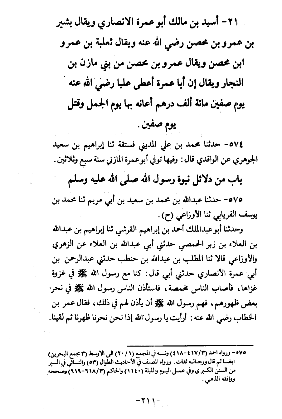 §أُسَيْدُ بْنُ مَالِكٍ أَبُو عَمْرَةَ الْأَنْصَارِيُّ " وَيُقَالُ: بَشِيرُ بْنُ عَمْرِو بْنِ مِحْصَنٍ رَضِيَ اللهُ عَنْهُ، وَيُقَالُ: ثَعْلَبَةُ بْنُ عَمْرِو بْنِ مِحْصَنٍ، وَيُقَالُ: عَمْرُو بْنُ مِحْصَنٍ مِنْ بَنِي مَازِنِ بْنِ النَّجَّارِ، وَيُقَالُ: إِنَّ أَبَا عَمْرَةَ أَعْطَى عَلِيًّا رَضِيَ اللهُ عَنْهُ يَوْمَ صِفِّينَ مِائَةَ أَلْفِ دِرْهَمٍ أَعَانَهُ بِهَا يَوْمَ الْجَمَلِ، وَقُتِلَ يَوْمَ صِفِّينَ "