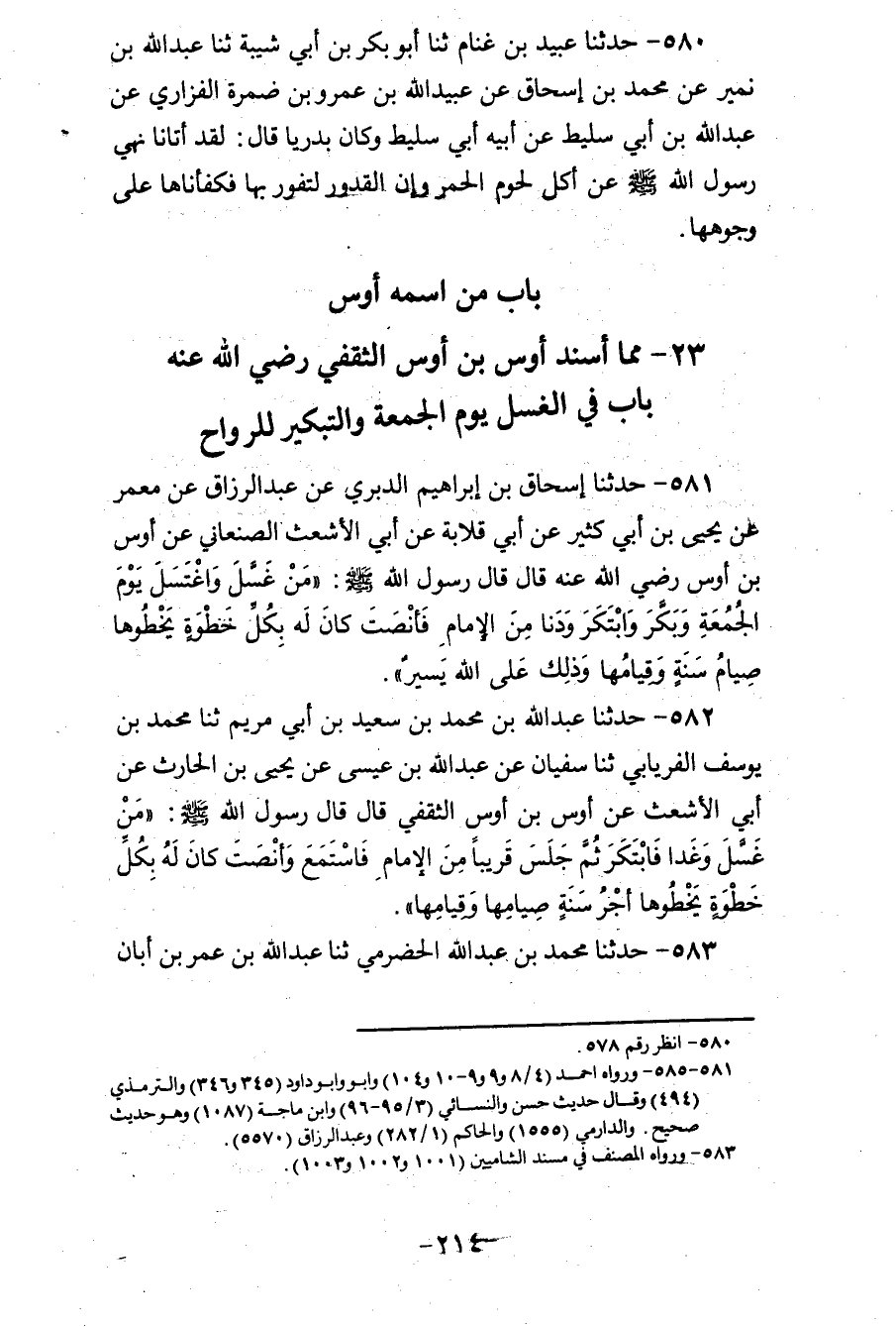 583 - حَدَّثَنَا مُحَمَّدُ بْنُ عَبْدِ اللهِ الْحَضْرَمِيُّ، ثنا عَبْدُ اللهِ بْنُ عُمَرَ بْنِ أَبَانَ، ثنا عَبْدُ الرَّحِيمِ بْنُ سُلَيْمَانَ، عَنْ أَبِي الْحَكَمِ الْأَعْرَجِ، عَنْ عَبْدِ اللهِ بْنِ عِيسَى، عَنْ يَحْيَى بْنِ الْحَارِثِ، عَنْ أَبِي الْأَشْعَثِ الصَّنْعَانِيِّ، عَنْ أَوْسِ بْنِ أَوْسٍ الثَّقَفِيِّ، عَنِ النَّبِيِّ صَلَّى اللهُ عَلَيْهِ وَسَلَّمَ أَنَّهُ قَالَ فِي يَوْمِ الْجُمُعَةِ: «§مَنْ غَسَّلَ وَاغْتَسَلَ وَبَكَّرَ، وَدَنَا فَاسْتَمَعَ، كَانَ لَهُ بِكُلِّ خُطْوَةٍ يَخْطُوهَا مِنْ بَيْتِهِ إِلَى الْمَسْجِدِ أَجْرُ سَنَةٍ، صِيَامُهَا وَقِيَامُهَا»