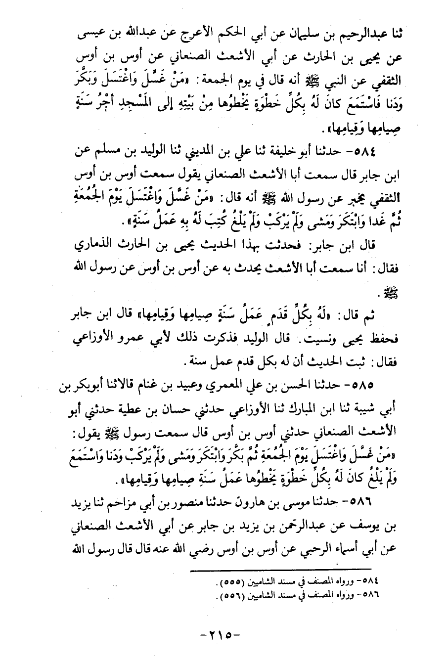 584 - حَدَّثَنَا أَبُو خَلِيفَةَ، ثنا عَلِيُّ بْنُ الْمَدِينِيِّ، ثنا الْوَلِيدُ بْنُ مُسْلِمٍ، عَنِ ابْنِ جَابِرٍ، قَالَ: سَمِعْتُ أَبَا الْأَشْعَثِ الصَّنْعَانِيَّ، يَقُولُ: سَمِعْتُ أَوْسَ بْنَ أَوْسٍ الثَّقَفِيَّ يُخْبِرُ عَنْ رَسُولِ اللهِ صَلَّى اللهُ عَلَيْهِ وَسَلَّمَ، أَنَّهُ قَالَ: «§مَنْ غَسَّلَ وَاغْتَسَلَ يَوْمَ الْجُمُعَةِ، ثُمَّ غَدَا، وَابْتَكَرَ، وَمَشَى وَلَمْ يَرْكَبْ، وَلَمْ يَلْغُ كُتِبَ لَهُ بِهِ عَمَلُ سَنَةٍ» قَالَ ابْنُ جَابِرٍ: فَحَدَّثْتُ بِهَذَا الْحَدِيثِ يَحْيَى بْنَ الْحَارِثِ الذِّمَارِيَّ، فَقَالَ: أَنَا سَمِعْتُ أَبَا الْأَشْعَثِ يُحَدِّثُ بِهِ، عَنْ أَوْسِ بْنِ أَوْسٍ، عَنْ رَسُولِ اللهِ صَلَّى اللهُ عَلَيْهِ وَسَلَّمَ، ثُمَّ قَالَ: «لَهُ بِكُلِّ قَدَمٍ عَمَلُ سَنَةٍ، صِيَامُهَا وَقِيَامُهَا» ، قَالَ ابْنُ جَابِرٍ: «فَحَفِظَ يَحْيَى وَنَسِيتُ» قَالَ الْوَلِيدُ: فَذَكَرْتُ ذَلِكَ لِأَبِي عَمْرٍو الْأَوْزَاعِيِّ، فَقَالَ: «ثَبَتَ الْحَدِيثُ أَنَّ لَهُ بِكُلِّ قَدَمٍ عَمَلَ سَنَةٍ»