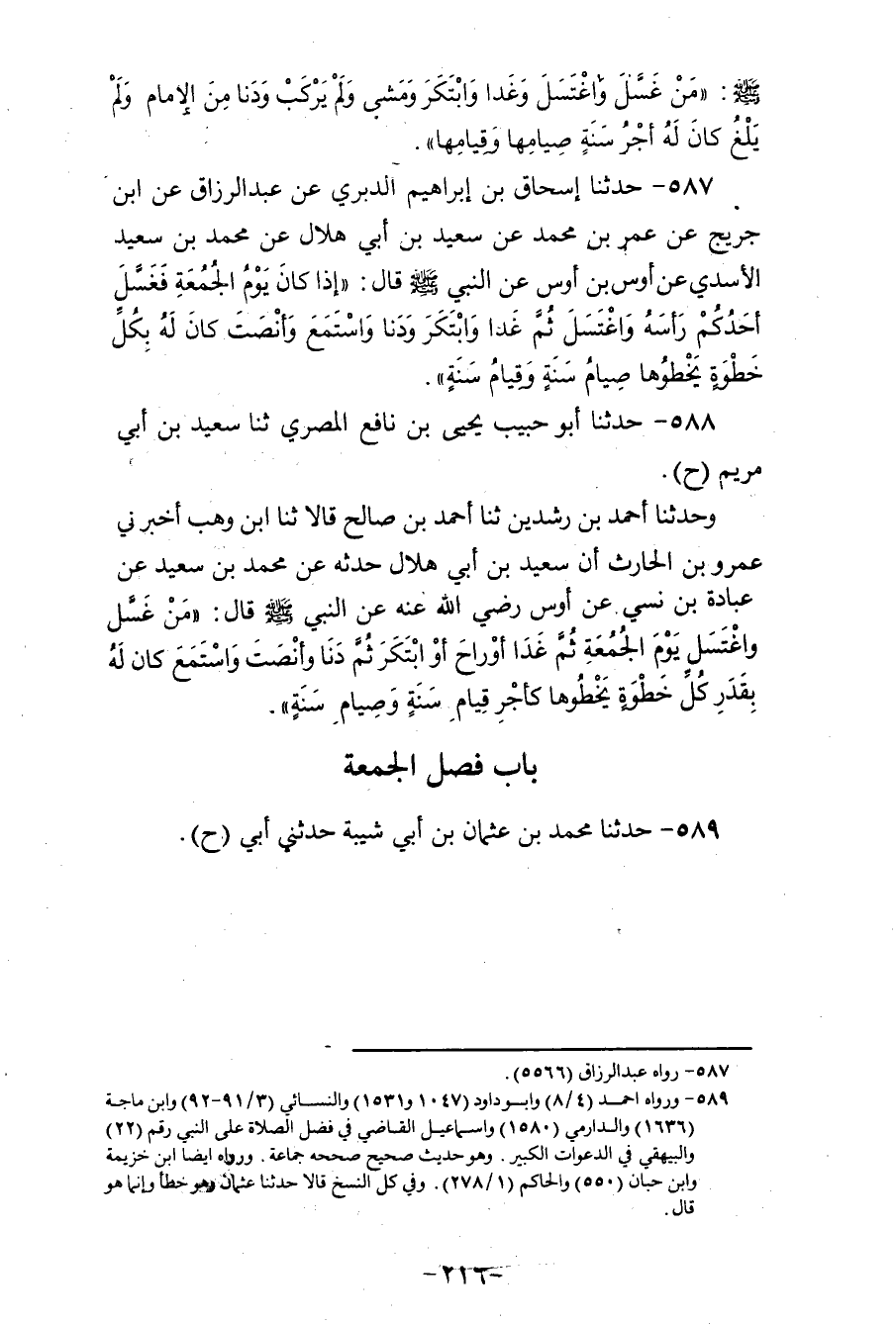 587 - حَدَّثَنَا إِسْحَاقُ بْنُ إِبْرَاهِيمَ الدَّبَرِيُّ، عَنْ عَبْدِ الرَّزَّاقِ، عَنِ ابْنِ جُرَيْجٍ، عَنْ عُمَرَ بْنِ مُحَمَّدٍ، عَنْ سَعِيدِ بْنِ أَبِي هِلَالٍ، عَنْ مُحَمَّدِ بْنِ سَعِيدٍ الْأَسَدِيِّ، عَنْ أَوْسِ بْنِ أَوْسٍ، عَنِ النَّبِيِّ صَلَّى اللهُ عَلَيْهِ وَسَلَّمَ قَالَ: «إِذَا كَانَ §يَوْمُ الْجُمُعَةِ فَغَسَلَ أَحَدُكُمْ رَأْسَهُ وَاغْتَسَلَ، ثُمَّ غَدَا وَابْتَكَرَ، وَدَنَا وَاسْتَمَعَ وَأَنْصَتَ، كَانَ لَهُ بِكُلِّ خُطْوَةٍ يَخْطُوهَا صِيَامُ سَنَةٍ، وَقِيَامُ سَنَةٍ»