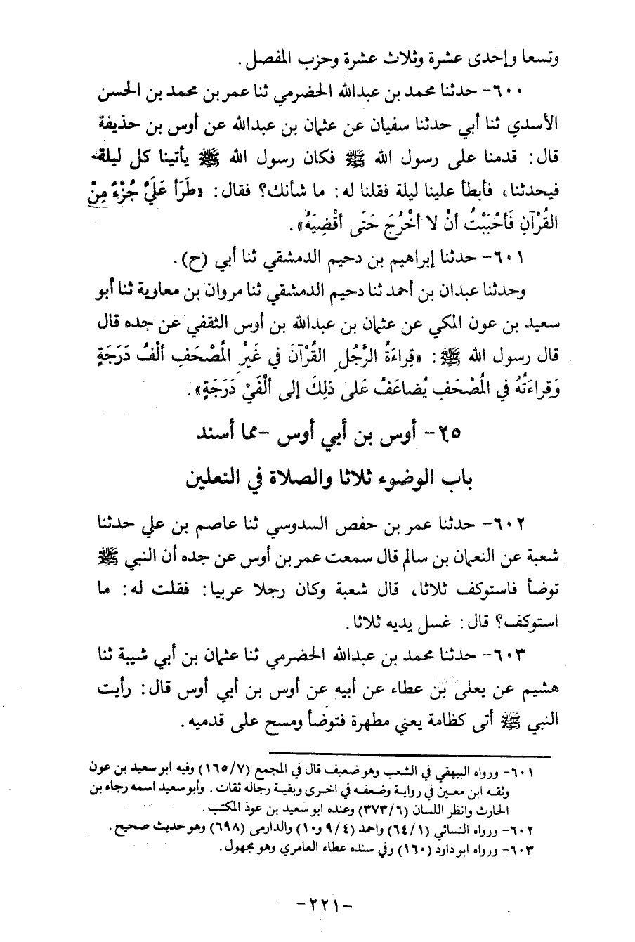 603 - حَدَّثَنَا مُحَمَّدُ بْنُ عَبْدِ اللهِ الْحَضْرَمِيُّ، ثنا عُثْمَانُ بْنُ أَبِي شَيْبَةَ، ثنا هُشَيْمٌ، عَنْ يَعْلَى بْنِ عَطَاءٍ، عَنْ أَبِيهِ، عَنْ أَوْسِ بْنِ أَبِي أَوْسٍ، قَالَ: «رَأَيْتُ النَّبِيَّ صَلَّى اللهُ عَلَيْهِ وَسَلَّمَ أَتَى كِظَامَةً - يَعْنِي مَطْهَرَةً - §فَتَوَضَّأَ وَمَسَحَ عَلَى قَدَمَيْهِ»
