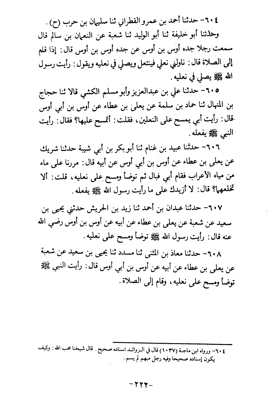 608 - حَدَّثَنَا مُعَاذُ بْنُ الْمُثَنَّى، ثنا مُسَدَّدٌ، ثنا يَحْيَى بْنُ سَعِيدٍ، عَنْ شُعْبَةَ، عَنْ يَعْلَى بْنِ عَطَاءٍ، عَنْ أَبِيهِ، عَنْ أَوْسِ بْنِ أَبِي أَوْسٍ، قَالَ: «رَأَيْتُ النَّبِيَّ صَلَّى اللهُ عَلَيْهِ وَسَلَّمَ §تَوَضَّأَ، وَمَسَحَ عَلَى نَعْلَيْهِ، وَقَامَ إِلَى الصَّلَاةِ»