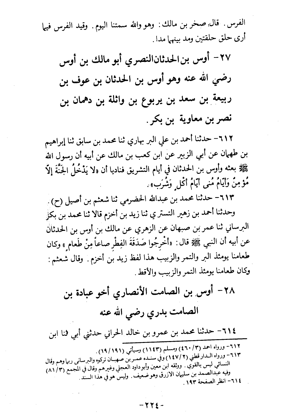 612 - حَدَّثَنَا أَحْمَدُ بْنُ عَلِيٍّ الْبَرْبَهَارِيُّ، ثنا مُحَمَّدُ بْنُ سَابِقٍ، ثنا إِبْرَاهِيمُ بْنُ طَهْمَانَ، عَنْ أَبِي الزُّبَيْرِ، عَنِ ابْنِ كَعْبِ بْنِ مَالِكٍ، عَنْ أَبِيهِ، أَنَّ رَسُولَ اللهِ صَلَّى اللهُ عَلَيْهِ وَسَلَّمَ بَعَثَهُ وَأَوْسَ بْنَ الْحَدَثَانِ فِي أَيَّامِ التَّشْرِيقِ، فَنَادَيَا أَنْ: «§لَا يَدْخُلَ الْجَنَّةَ إِلَّا مُؤْمِنٌ، وَأَيَّامُ مِنًى أَيَّامُ أَكْلٍ وَشُرْبٍ»