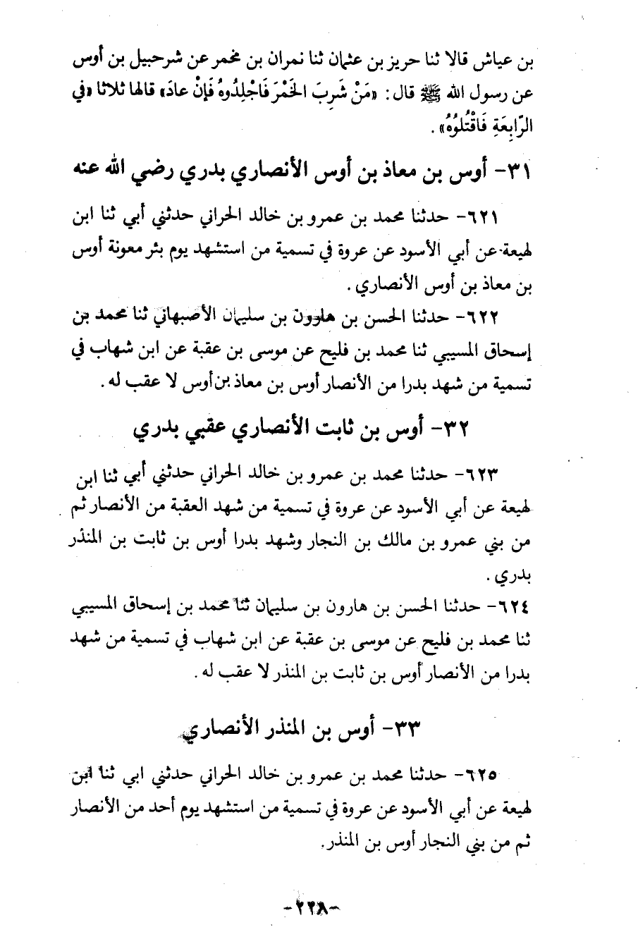 622 - حَدَّثَنَا الْحَسَنُ بْنُ هَارُونَ بْنِ سُلَيْمَانَ الْأَصْبَهَانِيُّ، ثنا مُحَمَّدُ بْنُ إِسْحَاقَ الْمُسَيَّبِيُّ، ثنا مُحَمَّدُ بْنُ فُلَيْحٍ، عَنْ مُوسَى بْنِ عُقْبَةَ، عَنِ ابْنِ شِهَابٍ " فِي تَسْمِيَةِ §مَنْ شَهِدَ بَدْرًا مِنَ الْأَنْصَارِ: أَوْسُ بْنُ مُعَاذِ بْنِ أَوْسٍ لَا عَقِبَ لَهُ "
