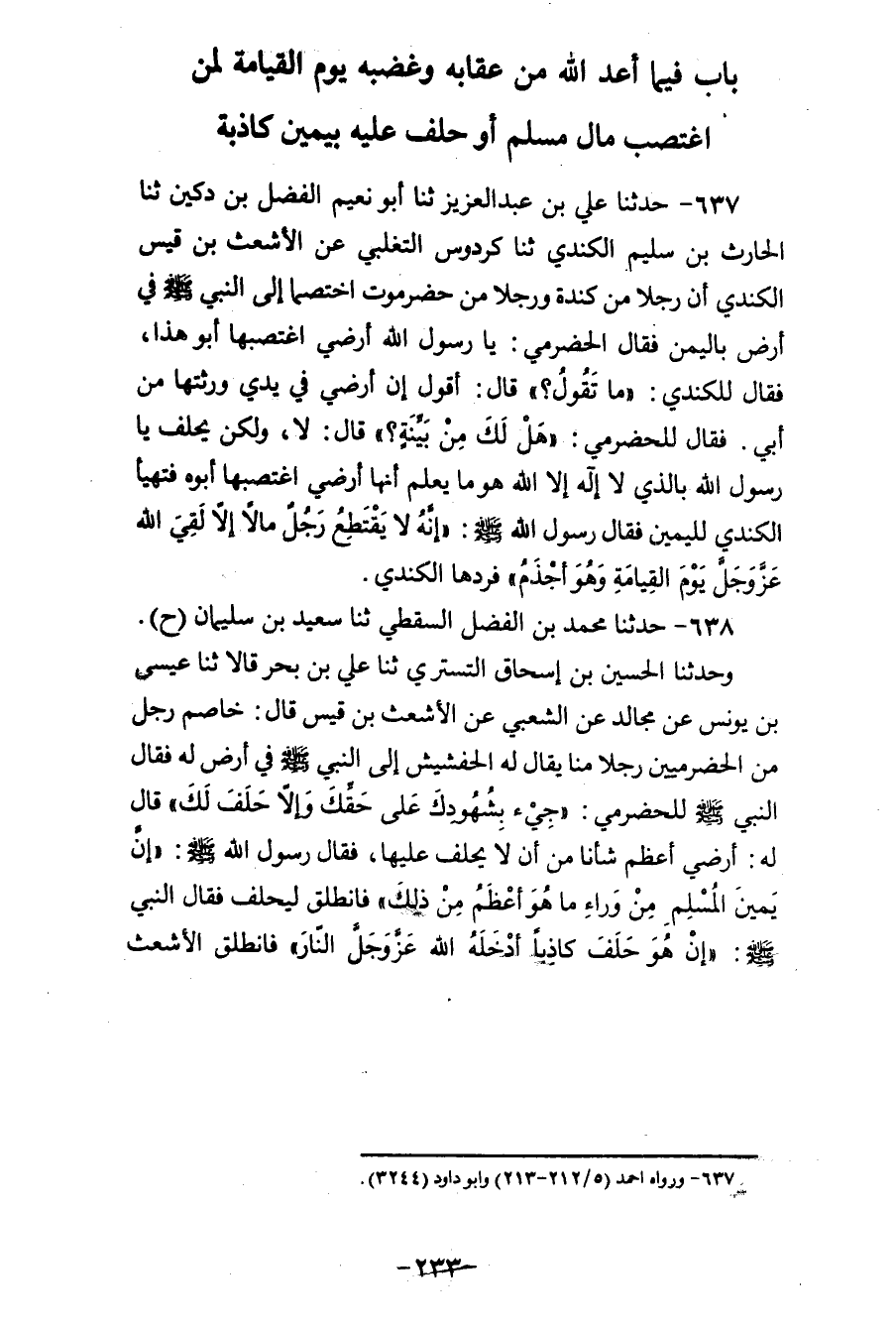 638 - حَدَّثَنَا مُحَمَّدُ بْنُ الْفَضْلِ السَّقَطِيُّ، ثنا سَعِيدُ بْنُ سُلَيْمَانَ، ح وَحَدَّثَنَا الْحُسَيْنُ بْنُ إِسْحَاقَ التُّسْتَرِيُّ، ثنا عَلِيُّ بْنُ بَحْرٍ، قَالَا: ثنا عِيسَى بْنُ يُونُسَ، عَنْ مُجَالِدٍ، عَنِ الشَّعْبِيِّ، عَنِ الْأَشْعَثِ بْنِ قَيْسٍ، قَالَ: خَاصَمَ رَجُلٌ مِنَ الْحَضْرَمِيِّينَ رَجُلًا مِنَّا، يُقَالُ لَهُ: الْحَفْشِيشُ إِلَى النَّبِيِّ صَلَّى اللهُ عَلَيْهِ وَسَلَّمَ فِي أَرْضٍ لَهُ، فَقَالَ النَّبِيُّ صَلَّى اللهُ عَلَيْهِ وَسَلَّمَ لِلْحَضْرَمِيِّ: «جِئْ بِشُهُودِكَ عَلَى حَقِّكَ، وَإِلَّا حَلَفَ لَكَ» قَالَ لَهُ: أَرْضِي أَعْظَمُ شَأْنًا مِنْ أَنْ لَا يَحْلِفَ عَلَيْهَا. فَقَالَ رَسُولُ اللهِ صَلَّى اللهُ عَلَيْهِ وَسَلَّمَ: «إِنَّ يَمِينَ الْمُسْلِمِ مِنْ وَرَاءِ مَا هُوَ أَعْظَمُ مِنْ ذَلِكَ» فَانْطَلَقَ لِيَحْلِفَ، فَقَالَ النَّبِيُّ صَلَّى اللهُ عَلَيْهِ وَسَلَّمَ: «§إِنْ هُوَ حَلَفَ كَاذِبًا، أَدْخَلَهُ اللهُ عَزَّ وَجَلَّ النَّارَ» ، فَانْطَلَقَ الْأَشْعَثُ فَأَخْبَرَهُ، فَقَالَ: أَصْلِحْ بَيْنِي وَبَيْنَهُ، فَأَصْلَحَ بَيْنَهُمَا