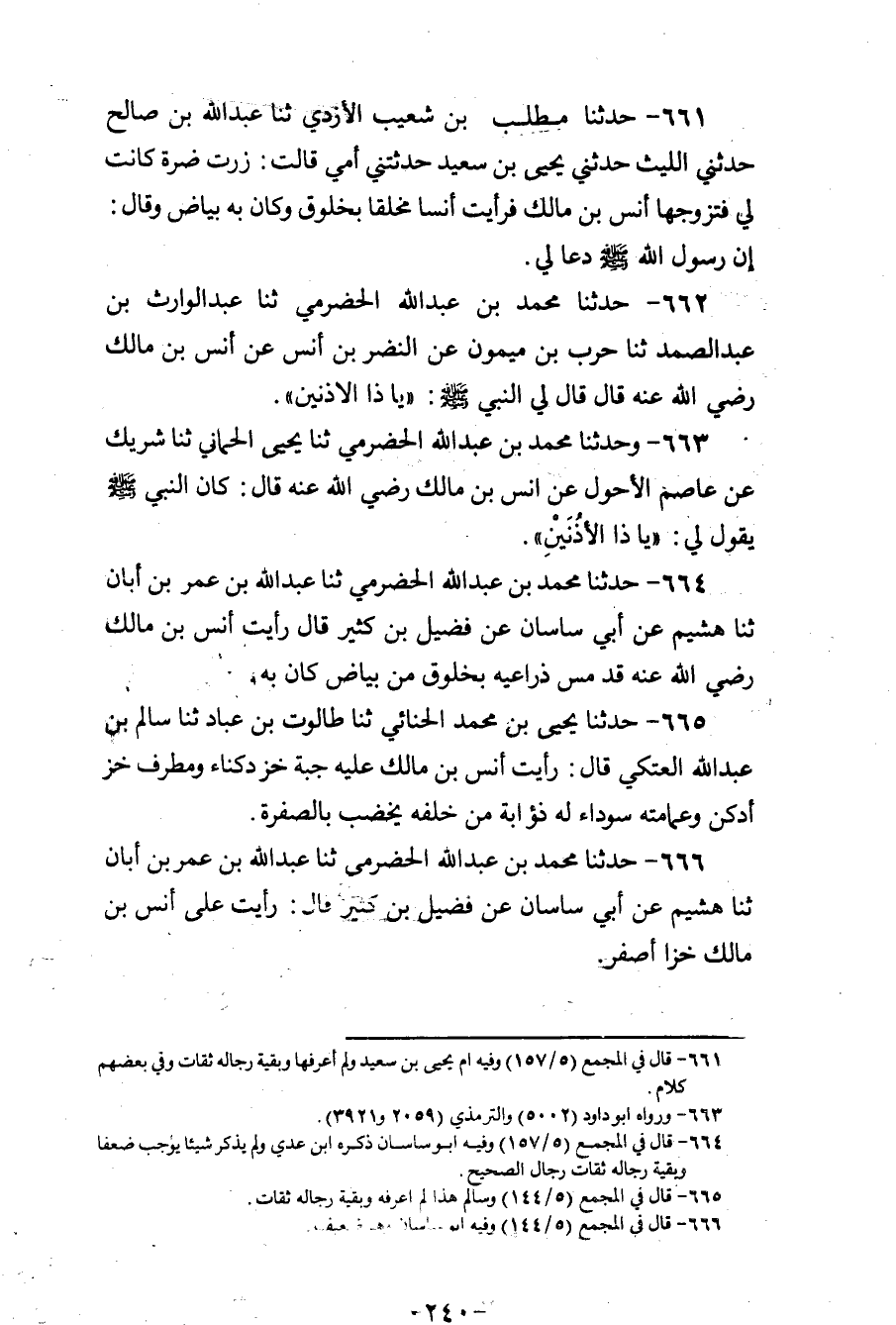 666 - حَدَّثَنَا مُحَمَّدُ بْنُ عَبْدِ اللهِ الْحَضْرَمِيُّ، ثنا عَبْدُ اللهِ بْنُ عُمَرَ بْنِ أَبَانَ، ثنا هُشَيْمٌ، عَنْ أَبِي سَاسَانَ، عَنْ فُضَيْلِ بْنِ كَثِيرٍ، قَالَ: «رَأَيْتُ عَلَى أَنَسِ بْنِ مَالِكٍ §خَزًّا أَصْفَرَ»