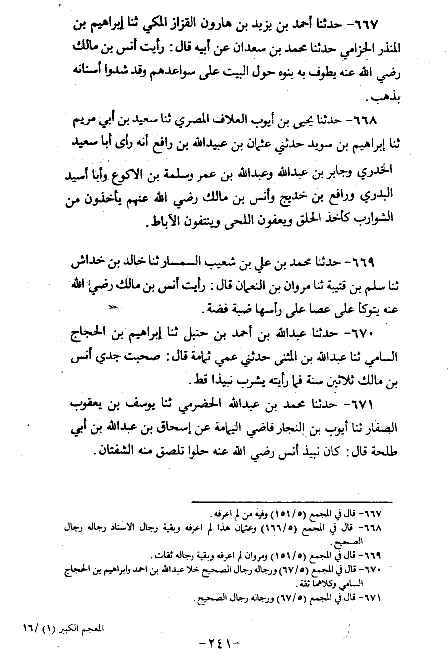 668 - حَدَّثَنَا يَحْيَى بْنُ أَيُّوبَ الْعَلَّافُ الْمِصْرِيُّ، ثنا سَعِيدُ بْنُ أَبِي مَرْيَمَ، ثنا إِبْرَاهِيمُ بْنُ سُوَيْدٍ، حَدَّثَنِي عُثْمَانُ بْنُ عُبَيْدِ اللهِ بْنِ رَافِعٍ، أَنَّهُ «رَأَى أَبَا سَعِيدٍ الْخُدْرِيَّ، وَجَابِرَ بْنَ عَبْدِ اللهٍ، وَعَبْدَ اللهِ بْنَ عُمَرَ، وَسَلَمَةَ بْنَ الْأَكْوَعِ، وَأَبَا أُسَيْدٍ الْبَدْرِيَّ، وَرَافِعَ بْنَ خَدِيجٍ، وَأَنَسَ بْنَ مَالِكٍ رَضِيَ اللهُ عَنْهُمْ §يَأْخُذُونَ مِنَ الشَّوَارِبِ كَأَخْذِ الْحَلْقِ، وَيُعْفُونَ اللِّحَى، وَيَنْتِفُونَ الْآبَاطَ»