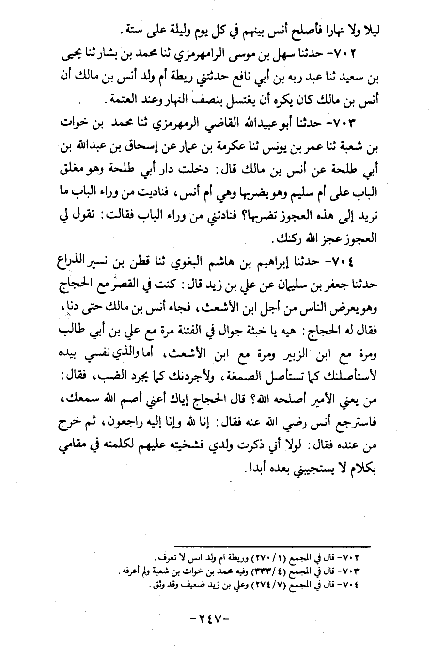 704 - حَدَّثَنَا إِبْرَاهِيمُ بْنُ هَاشِمٍ الْبَغَوِيُّ، ثنا قَطَنُ بْنُ نُسَيْرٍ الذِّرَاعُ، حَدَّثَنَا جَعْفَرُ بْنُ سُلَيْمَانَ، عَنْ عَلِيِّ بْنِ زَيْدٍ، قَالَ: كُنْتُ فِي الْقَصْرِ مَعَ الْحَجَّاجِ، وَهُوَ يَعْرِضُ النَّاسَ مِنْ أَجْلِ ابْنِ الْأَشْعَثِ، فَجَاءَ أَنَسُ بْنُ مَالِكٍ حَتَّى دَنَا، فَقَالَ لَهُ الْحَجَّاجُ: هِيهِ يَا خِبْثَةُ، جَوَّالٌ فِي الْفِتْنَةِ مَرَّةً مَعَ عَلِيِّ بْنِ أَبِي طَالِبٍ، وَمَرَّةً مَعَ ابْنِ الزُّبَيْرِ، وَمَرَّةً مَعَ ابْنِ الْأَشْعَثِ، أَمَا وَالَّذِي نَفْسِي بِيَدِهِ لَأَسْتَأْصِلَنَّكَ كَمَا تُسْتَأْصَلُ الصَّمْغَةُ، وَلَأُجَرِّدَنَّكَ كَمَا يُجَرَّدُ الضَّبُّ، فَقَالَ: مَنْ يَعْنِي الْأَمِيرُ أَصْلَحَهُ اللهُ؟ قَالَ الْحَجَّاجُ: إِيَّاكَ أَعْنِي، أَصَمَّ اللهُ سَمْعَكَ، فَاسْتَرْجَعَ أَنَسٌ رَضِيَ اللهُ عَنْهُ، فَقَالَ: «§إِنَّا لِلَّهِ، وَإِنَّا إِلَيْهِ رَاجِعُونَ» ثُمَّ خَرَجَ مِنْ عِنْدِهِ، فَقَالَ: «لَوْلَا أَنِّي ذَكَرْتُ وَلَدِي فَخَشِيتُهُ عَلَيْهِمْ، لَكَلَّمْتُهُ فِي مَقَامِي بِكَلَامٍ لَا يَسْتَجِيبُنِي بَعْدَهُ أَبَدًا»
