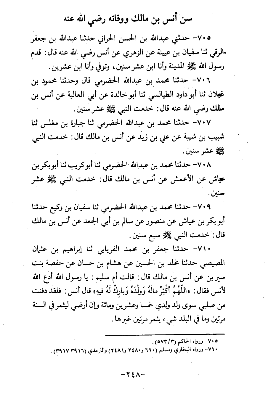 710 - حَدَّثَنَا جَعْفَرُ بْنُ مُحَمَّدٍ الْفِرْيَابِيُّ، ثنا إِبْرَاهِيمُ بْنُ عُثْمَانَ الْمِصِّيصِيُّ، حَدَّثَنَا مَخْلَدُ بْنُ الْحُسَيْنِ، عَنْ هِشَامِ بْنِ حَسَّانَ، عَنْ حَفْصَةَ بِنْتِ سِيرِينَ، عَنْ أَنَسِ بْنِ مَالِكٍ، قَالَ: قَالَتْ أُمُّ سُلَيْمٍ: يَا رَسُولَ اللهِ، ادْعُ اللهَ لِأَنَسٍ، فَقَالَ: «§اللهُمَّ أَكْثِرْ مَالَهُ وَوَلَدَهُ، وَبَارِكْ لَهُ فِيهِ» ، قَالَ أَنَسٌ: «فَلَقَدْ دَفَنْتُ مِنْ صُلْبِي سِوَى وَلَدِ وَلَدِي خَمْسًا وَعِشْرِينَ وَمِائَةً، وَإِنَّ أَرْضِي لَيُثْمِرُ فِي السَّنَةِ مَرَّتَيْنِ، وَمَا فِي الْبَلَدِ شَيْءٌ يُثْمِرُ مَرَّتَيْنِ غَيْرَهَا»