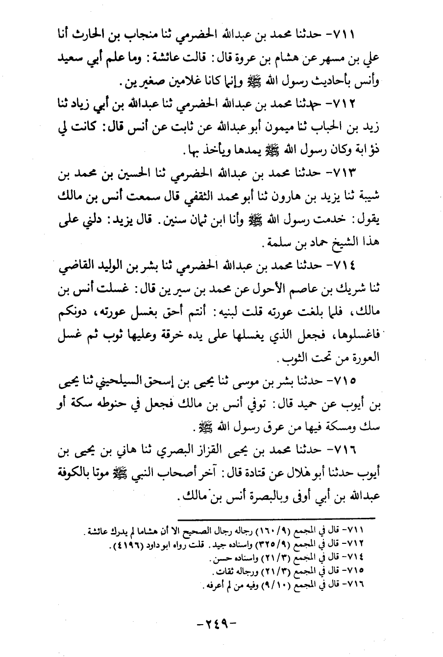 711 - حَدَّثَنَا مُحَمَّدُ بْنُ عَبْدِ اللهِ الْحَضْرَمِيُّ، ثنا مِنْجَابُ بْنُ الْحَارِثِ، أَنَا عَلِيُّ بْنُ مُسْهِرٍ، عَنْ هِشَامِ بْنِ عُرْوَةَ، قَالَ: قَالَتْ عَائِشَةُ: «§وَمَا عِلْمُ أَبِي سَعِيدٍ، وَأَنَسٍ بِأَحَادِيثِ رَسُولِ اللهِ صَلَّى اللهُ عَلَيْهِ وَسَلَّمَ، وَإِنَّمَا كَانَا غُلَامَيْنِ صَغِيرَيْنِ»