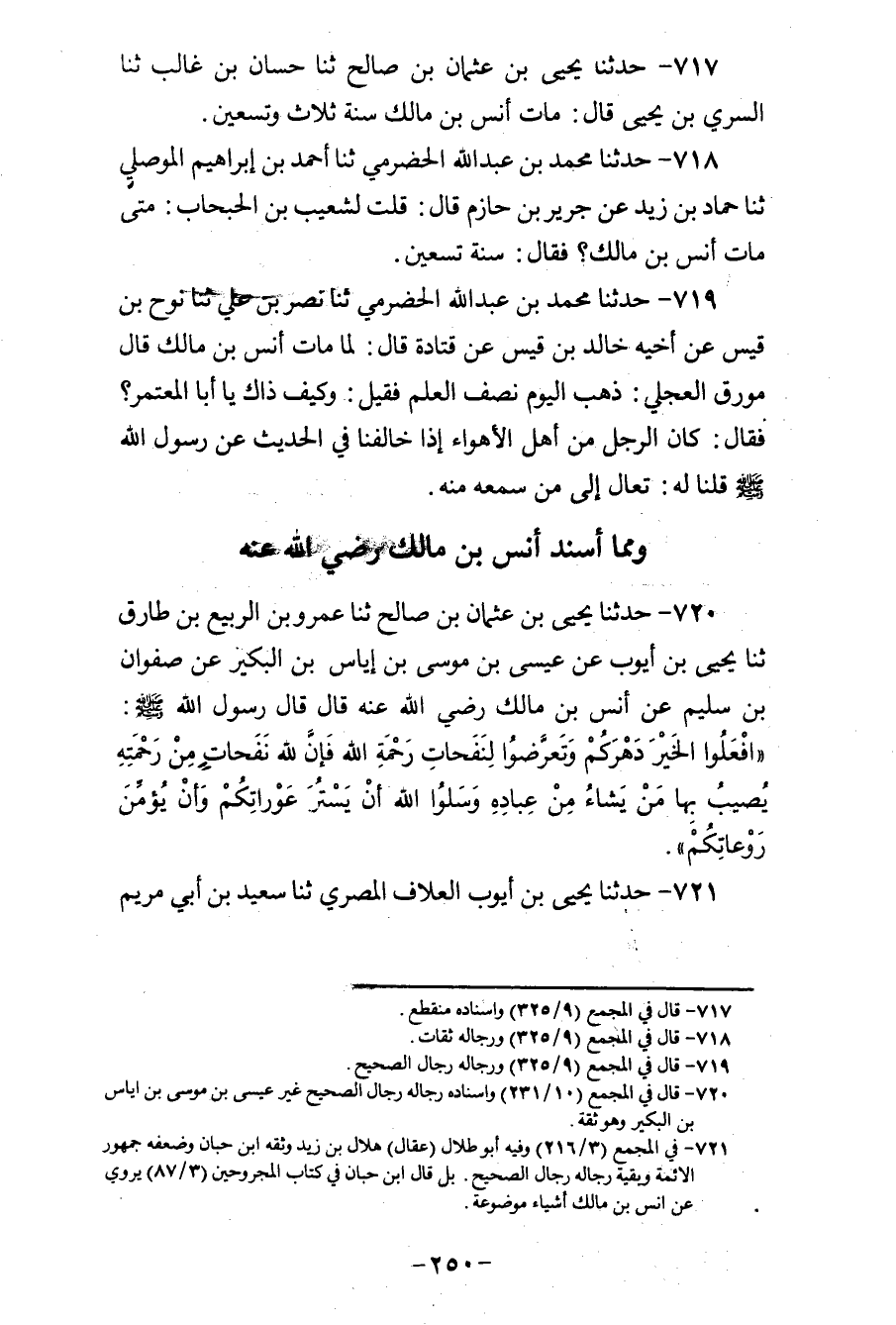 718 - حَدَّثَنَا مُحَمَّدُ بْنُ عَبْدِ اللهِ الْحَضْرَمِيُّ، ثنا أَحْمَدُ بْنُ إِبْرَاهِيمَ الْمَوْصِلِيُّ، ثنا حَمَّادُ بْنُ زَيْدٍ، عَنْ جَرِيرِ بْنِ حَازِمٍ، قَالَ: قُلْتُ لِشُعَيْبِ بْنِ الْحَبْحَابِ: §مَتَى مَاتَ أَنَسُ بْنُ مَالِكٍ؟ فَقَالَ: «سَنَةَ تِسْعِينَ»