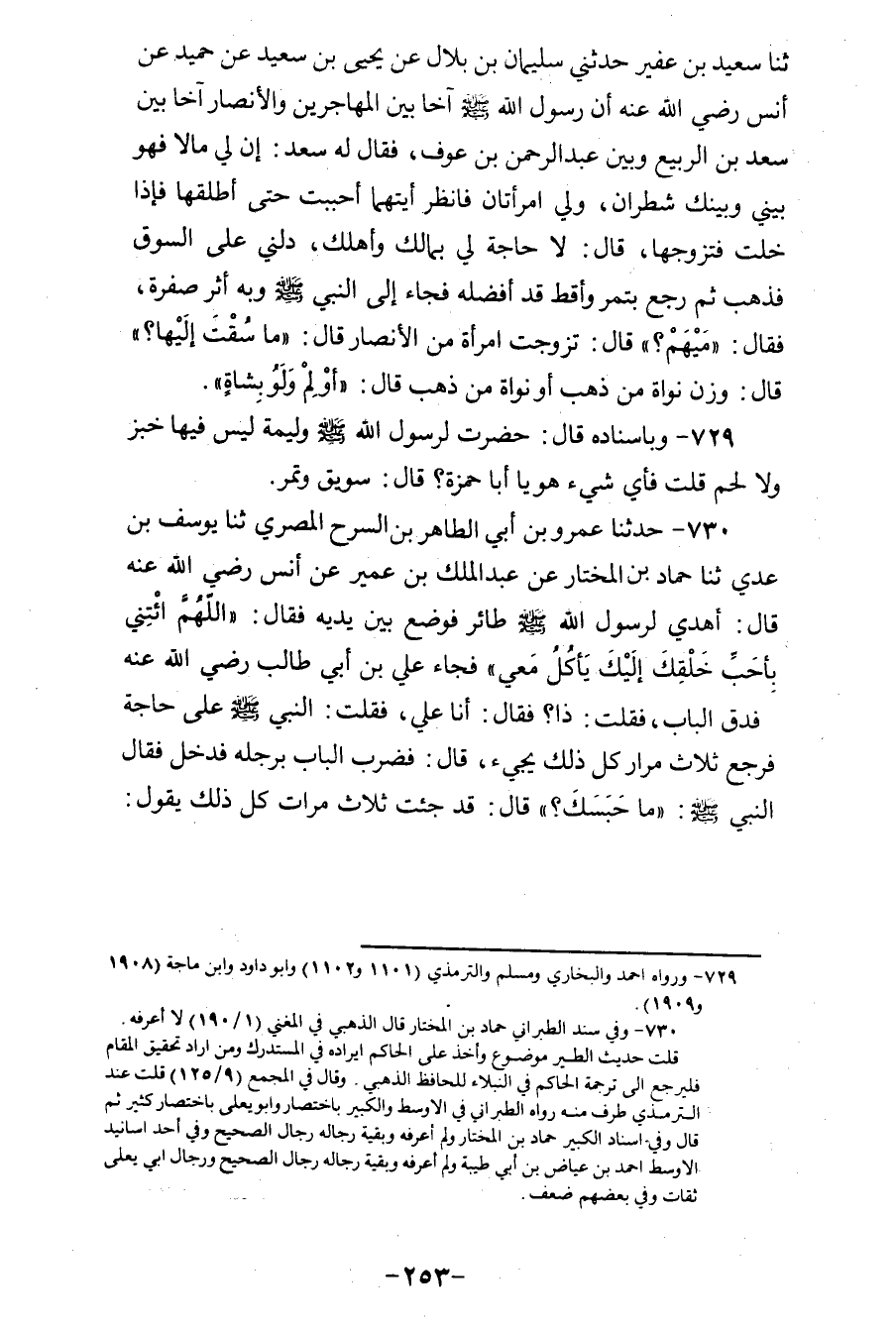 730 - حَدَّثَنَا عَمْرُو بْنُ أَبِي الطَّاهِرِ بْنِ السَّرْحِ الْمِصْرِيُّ، ثنا يُوسُفُ بْنُ عَدِيٍّ، ثنا حَمَّادُ بْنُ الْمُخْتَارِ، عَنْ عَبْدِ الْمَلِكِ بْنِ عُمَيْرٍ، عَنْ أَنَسٍ رَضِيَ اللهُ عَنْهُ، قَالَ: أُهْدِيَ لِرَسُولِ اللهِ صَلَّى اللهُ عَلَيْهِ وَسَلَّمَ طَائِرٌ، فَوَضَعَ بَيْنَ يَدَيْهِ، فَقَالَ: «§اللهُمَّ ائْتِنِي بِأَحَبِّ خَلْقِكَ إِلَيْكَ يَأْكُلُ مَعِي» فَجَاءَ عَلِيُّ بْنُ أَبِي طَالِبٍ رَضِيَ اللهُ عَنْهُ، فَدَقَّ الْبَابَ، فَقُلْتُ: ذَا؟ فَقَالَ: أَنَا عَلِيٌّ، فَقُلْتُ: النَّبِيُّ صَلَّى اللهُ عَلَيْهِ وَسَلَّمَ عَلَى حَاجَةٍ، فَرَجَعَ ثَلَاثَ مِرَارٍ، كُلُّ ذَلِكَ يَجِيءُ، قَالَ: فَضَرَبَ الْبَابَ بِرِجْلِهِ فَدَخَلَ، فَقَالَ النَّبِيُّ صَلَّى اللهُ عَلَيْهِ وَسَلَّمَ: «مَا حَبَسَكَ؟» قَالَ: قَدْ جِئْتُ ثَلَاثَ مَرَّاتٍ، كُلُّ ذَلِكَ يَقُولُ: النَّبِيُّ صَلَّى اللهُ عَلَيْهِ وَسَلَّمَ عَلَى حَاجَةٍ، فَقَالَ النَّبِيُّ صَلَّى اللهُ عَلَيْهِ وَسَلَّمَ: «مَا حَمَلَكَ عَلَى ذَلِكَ؟» قُلْتُ: كُنْتُ أَرَدْتُ أَنْ يَكُونَ رَجُلٌ مِنْ قَوْمِي