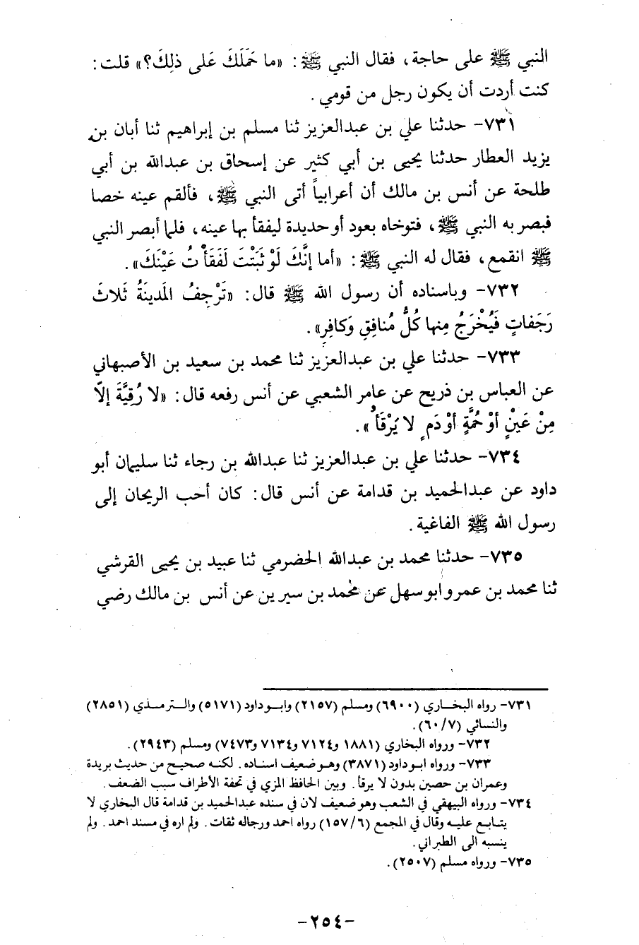 731 - حَدَّثَنَا عَلِيُّ بْنُ عَبْدِ الْعَزِيزِ، ثنا مُسْلِمُ بْنُ إِبْرَاهِيمَ، ثنا أَبَانُ بْنُ يَزِيدَ الْعَطَّارُ، حَدَّثَنَا يَحْيَى بْنُ أَبِي كَثِيرٍ، عَنْ إِسْحَاقَ بْنِ عَبْدِ اللهِ بْنِ أَبِي طَلْحَةَ، عَنْ أَنَسِ بْنِ مَالِكٍ، أَنَّ أَعْرَابِيًّا أَتَى النَّبِيَّ صَلَّى اللهُ عَلَيْهِ وَسَلَّمَ، فَأَلْقَمْ عَيْنَهُ خُصًّا، فَبَصُرَ بِهِ النَّبِيُّ صَلَّى اللهُ عَلَيْهِ وَسَلَّمَ، فَتَوَخَّاهُ بِعُودٍ، أَوْ حَدِيدَةٍ لِيَفْقَأَ بِهَا عَيْنَهُ، فَلَمَّا أَبْصَرَ النَّبِيَّ صَلَّى اللهُ عَلَيْهِ وَسَلَّمَ انْقَمَعَ، فَقَالَ لَهُ النَّبِيُّ صَلَّى اللهُ عَلَيْهِ وَسَلَّمَ: «أَمَا §إِنَّكَ لَوْ ثَبَتَّ لَفَقَأْتُ عَيْنَكَ»