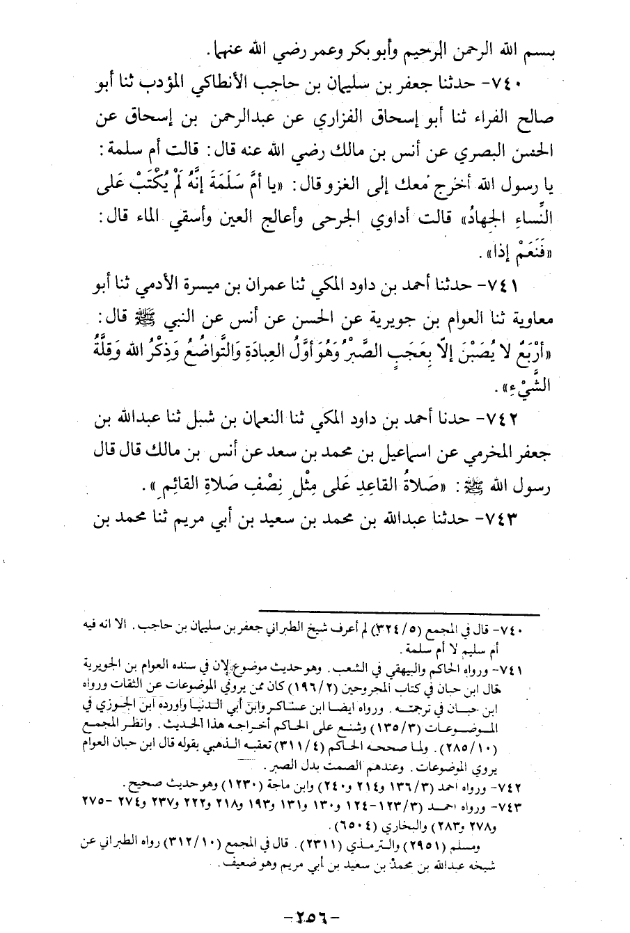 740 - حَدَّثَنَا جَعْفَرُ بْنُ سُلَيْمَانَ بْنِ حَاجِبٍ الْأَنْطَاكِيُّ الْمُؤَدِّبِ، ثنا أَبُو صَالِحٍ الْفَرَّاءُ، ثنا أَبُو إِسْحَاقَ الْفَزَارِيُّ، عَنْ عَبْدِ الرَّحْمَنِ بْنِ إِسْحَاقَ، عَنِ الْحَسَنِ الْبَصْرِيِّ، عَنْ أَنَسِ بْنِ مَالِكٍ رَضِيَ اللهُ عَنْهُ، قَالَ: قَالَتْ أُمُّ سَلَمَةَ: يَا رَسُولَ اللهِ، أَخْرَجُ مَعَكَ إِلَى الْغَزْوِ؟ قَالَ: «يَا أُمَّ سَلَمَةَ، إِنَّهُ §لَمْ يُكْتَبْ عَلَى النِّسَاءِ الْجِهَادُ» قَالَتْ: أُدَاوِي الْجَرْحَى، وَأُعَالِجُ الْعَيْنَ، وَأَسْقَى الْمَاءَ، قَالَ: «فَنَعَمْ إِذًا»