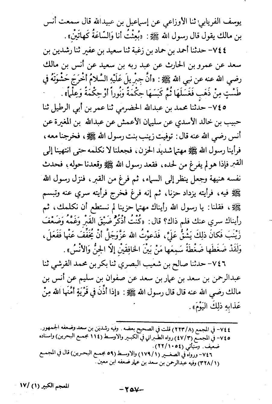 745 - حَدَّثَنَا مُحَمَّدُ بْنُ عَبْدِ اللهِ الْحَضْرَمِيُّ، ثنا عُمَرُ بْنُ أَبِي الرُّطَيْلِ، ثنا حَبِيبُ بْنُ خَالِدٍ الْأَسَدِيُّ، عَنْ سُلَيْمَانَ الْأَعْمَشِ، عَنْ عَبْدِ اللهِ بْنِ الْمُغِيرَةِ، عَنْ أَنَسٍ رَضِيَ اللهُ عَنْهُ قَالَ: تُوُفِّيَتْ زَيْنَبُ بِنْتُ رَسُولِ اللهِ صَلَّى اللهُ عَلَيْهِ وَسَلَّمَ، فَخَرَجْنَا مَعَهُ، فَرَأَيْنَا رَسُولَ اللهِ صَلَّى اللهُ عَلَيْهِ وَسَلَّمَ مُهْتَمًّا شَدِيدَ الْحُزْنِ، فَجَعَلْنَا لَا نُكَلِّمُهُ حَتَّى انْتَهَيْنَا إِلَى الْقَبْرِ، فَإِذَا هُوَ لَمْ يَفْرُغْ مِنْ لَحْدِهِ، فَقَعَدَ رَسُولُ اللهِ صَلَّى اللهُ عَلَيْهِ وَسَلَّمَ، وَقَعَدْنَا حَوْلَهُ، فَحَدَّثَ نَفْسَهُ هُنَيْهَةً وَجَعَلَ يَنْظُرُ إِلَى السَّمَاءِ، ثُمَّ فَرَغَ مِنَ الْقَبْرِ، فَنَزَلَ رَسُولُ اللهِ صَلَّى اللهُ عَلَيْهِ وَسَلَّمَ فِيهِ، فَرَأَيْتُهُ يَزْدَادُ حُزْنًا، ثُمَّ إِنَّهُ فَرَغَ فَخَرَجَ، فَرَأَيْتُهُ سُرِّيَ عَنْهُ وَتَبَسَّمَ صَلَّى اللهُ عَلَيْهِ وَسَلَّمَ، فَقُلْنَا: يَا رَسُولَ اللهِ، رَأَيْنَاكَ مُهْتَمًّا حَزِينًا لَمْ نَسْتَطِعْ أَنْ نُكَلِّمَكَ، ثُمَّ رَأَيْنَاكَ سُرِّيَ عَنْكَ فَلِمَ ذَاكَ؟ قَالَ: «§كُنْتُ أَذْكُرُ ضِيقَ الْقَبْرِ وَغَمِّهِ وَضَعْفَ زَيْنَبَ، فَكَانَ ذَلِكَ يَشُقُّ عَلَيَّ، فَدَعَوْتُ اللهَ عَزَّ وَجَلَّ أَنُ يُخَفِّفَ عَنْهَا فَفَعَلَ، وَلَقَدْ ضَغَطَهَا ضَغْطَةً سَمِعَهَا مَنْ بَيْنَ الْخَافِقَيْنِ إِلَّا الْجِنَّ وَالْإِنْسَ»