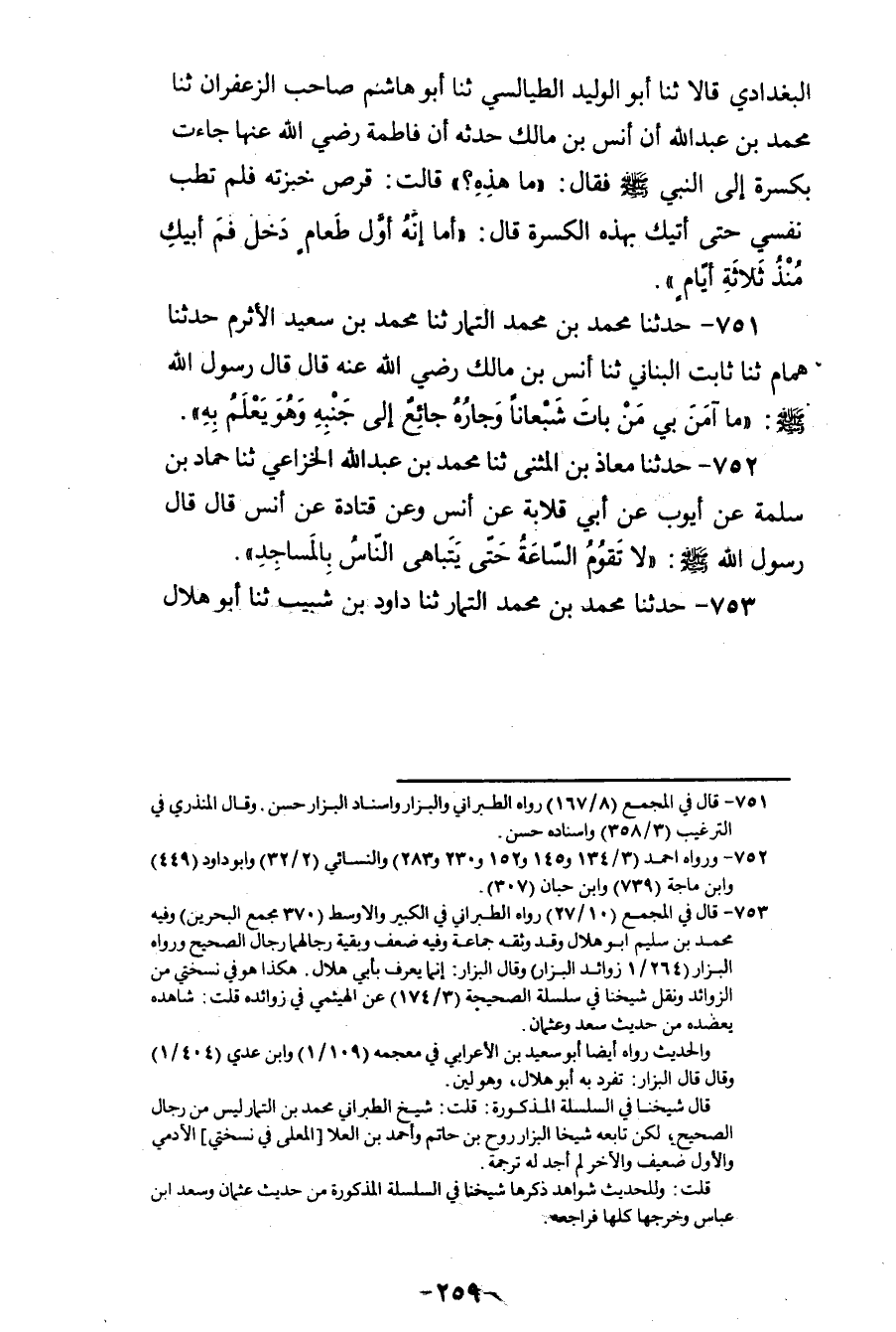 752 - حَدَّثَنَا مُعَاذُ بْنُ الْمُثَنَّى، ثنا مُحَمَّدُ بْنُ عَبْدِ اللهِ الْخُزَاعِيُّ، ثنا حَمَّادُ بْنُ سَلَمَةَ، عَنْ أَيُّوبَ، عَنْ أَبِي قِلَابَةَ، عَنْ أَنَسٍ، وَعَنْ قَتَادَةَ، عَنْ أَنَسٍ، قَالَ: قَالَ رَسُولُ اللهِ صَلَّى اللهُ عَلَيْهِ وَسَلَّمَ: «§لَا تَقُومُ السَّاعَةُ حَتَّى يَتَبَاهَى النَّاسُ بِالْمَسَاجِدِ»