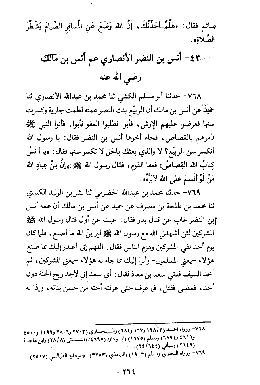 768 - حَدَّثَنَا أَبُو مُسْلِمٍ الْكَشِّيُّ، ثنا مُحَمَّدُ بْنُ عَبْدِ اللهِ الْأَنْصَارِيُّ، ثنا حُمَيْدٌ، عَنْ أَنَسِ بْنِ مَالِكٍ، أَنَّ الرُّبَيِّعَ بِنْتَ النَّضْرِ، عَمَّتَهُ لَطَمَتْ جَارِيَةً وَكَسَرَتْ سِنَّهَا، فَعَرَضُوا عَلَيْهِمُ الْأَرْشَ فَأَبَوْا، فَطَلَبُوا الْعَفْوَ، فَأَبَوْا، فَأَتَوُا النَّبِيَّ صَلَّى اللهُ عَلَيْهِ وَسَلَّمَ، فَأَمَرَهُمْ بِالْقِصَاصِ، فَجَاءَ أَخُوهَا أَنَسُ بْنُ النَّضْرِ، فَقَالَ: يَا رَسُولَ اللهِ، أَتُكْسَرُ سِنُّ الرُّبَيِّعِ؟ لَا، وَالَّذِي بَعَثَكَ بِالْحَقِّ، لَا تُكْسَرُ سِنُّهَا، فَقَالَ: «يَا أَنَسُ، كِتَابُ اللهِ الْقِصَاصُ، فَعَفَا الْقَوْمُ» فَقَالَ رَسُولُ اللهِ صَلَّى اللهُ عَلَيْهِ وَسَلَّمَ: «إِنَّ §مِنْ عِبَادِ اللهِ مَنْ لَوْ أَقْسَمَ عَلَى اللهِ لَأَبَرَّهُ»