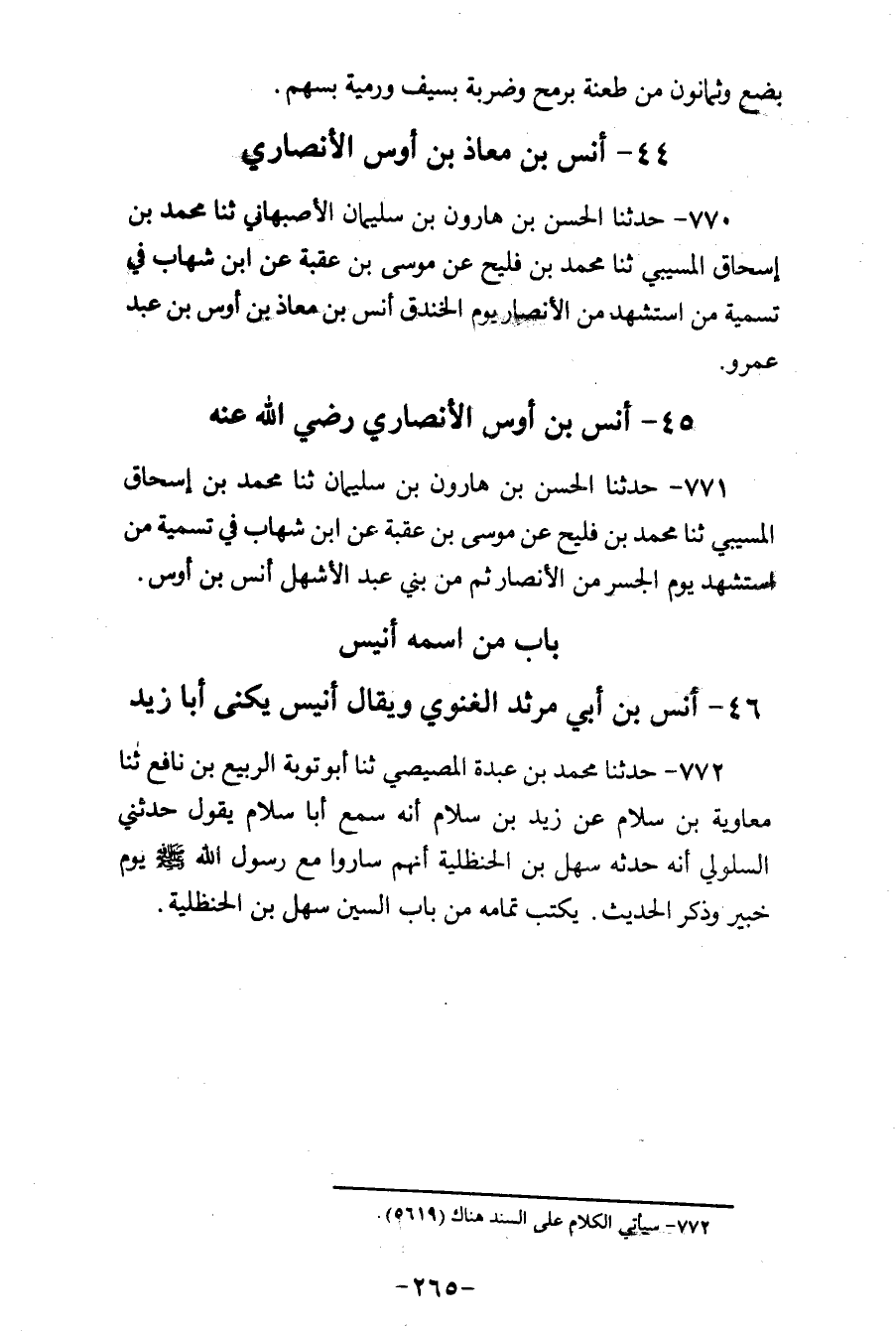770 - حَدَّثَنَا الْحَسَنُ بْنُ هَارُونَ بْنِ سُلَيْمَانَ الْأَصْبَهَانِيُّ، ثنا مُحَمَّدُ بْنُ إِسْحَاقَ الْمُسَيَّبِيُّ، ثنا مُحَمَّدُ بْنُ فُلَيْحٍ، عَنْ مُوسَى بْنِ عُقْبَةَ، عَنِ ابْنِ شِهَابٍ " فِي تَسْمِيَةِ §مَنِ اسْتُشْهِدَ مِنَ الْأَنْصَارِ يَوْمَ الْخَنْدَقِ: أَنَسُ بْنُ مُعَاذِ بْنِ أَوْسِ بْنِ عَبْدِ عَمْرٍو "