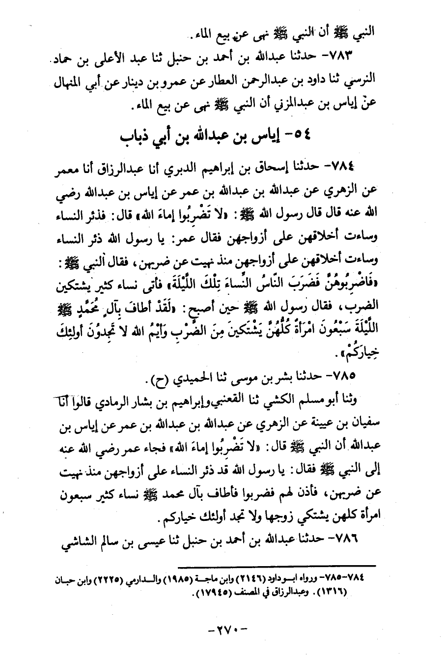 785 - حَدَّثَنَا بِشْرُ بْنُ مُوسَى، ثنا الْحُمَيْدِيُّ، ح وَثنا أَبُو مُسْلِمٍ الْكَشِّيُّ، ثنا الْقَعْنَبِيُّ، وَإِبْرَاهِيمُ بْنُ بَشَّارٍ الرَّمَادِيُّ، قَالُوا: أَنَا سُفْيَانُ بْنُ عُيَيْنَةَ، عَنِ الزُّهْرِيِّ، عَنْ عَبْدِ اللهِ بْنِ عَبْدِ اللهِ بْنِ عُمَرَ، عَنْ إِيَاسِ بْنِ عَبْدِ اللهِ، أَنَّ النَّبِيَّ صَلَّى اللهُ عَلَيْهِ وَسَلَّمَ قَالَ: «§لَا تَضْرِبُوا إِمَاءَ اللهِ» فَجَاءَ عُمَرُ رَضِيَ اللهُ عَنْهُ إِلَى النَّبِيِّ صَلَّى اللهُ عَلَيْهِ وَسَلَّمَ، فَقَالَ: يَا رَسُولَ اللهِ، قَدْ ذَئِرَ النِّسَاءُ عَلَى أَزْوَاجِهِنِّ مُنْذُ نَهَيْتَ عَنْ ضَرْبِهِنِّ، فَأَذِنَ لَهُمْ، فَضَرَبُوا، فَأَطَافَ بِآلِ مُحَمَّدٍ صَلَّى اللهُ عَلَيْهِ وَسَلَّمَ نِسَاءٌ كَثِيرٌ سَبْعُونَ امْرَأَةً، كُلُّهُنَّ يَشْتَكِي زَوْجُهَا، وَلَا تَجِدُ أُولَئِكَ خِيَارَكُمْ