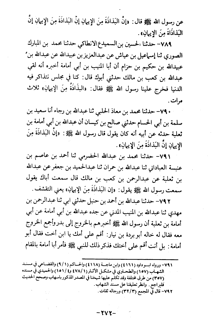790 - حَدَّثَنَا مُحَمَّدُ بْنُ مُعَاذٍ الْحَلَبِيُّ، ثنا عَبْدُ اللهِ بْنُ رَجَاءٍ، أَنَا سَعِيدُ بْنُ سَلَمَةَ بْنِ أَبِي الْحُسَامِ، حَدَّثَنِي صَالِحُ بْنُ كَيْسَانَ، أَنَّ عَبْدَ اللهِ بْنَ أَبِي أُمَامَةَ بْنِ ثَعْلَبَةَ حَدَّثَهُ، عَنْ أَبِيهِ، أَنَّهُ كَانَ يَقُولُ: قَالَ رَسُولُ اللهِ صَلَّى اللهُ عَلَيْهِ وَسَلَّمَ: «إِنَّ §الْبَذَاذَةَ مِنَ الْإِيمَانِ، إِنَّ الْبَذَاذَةَ مِنَ الْإِيمَانِ»