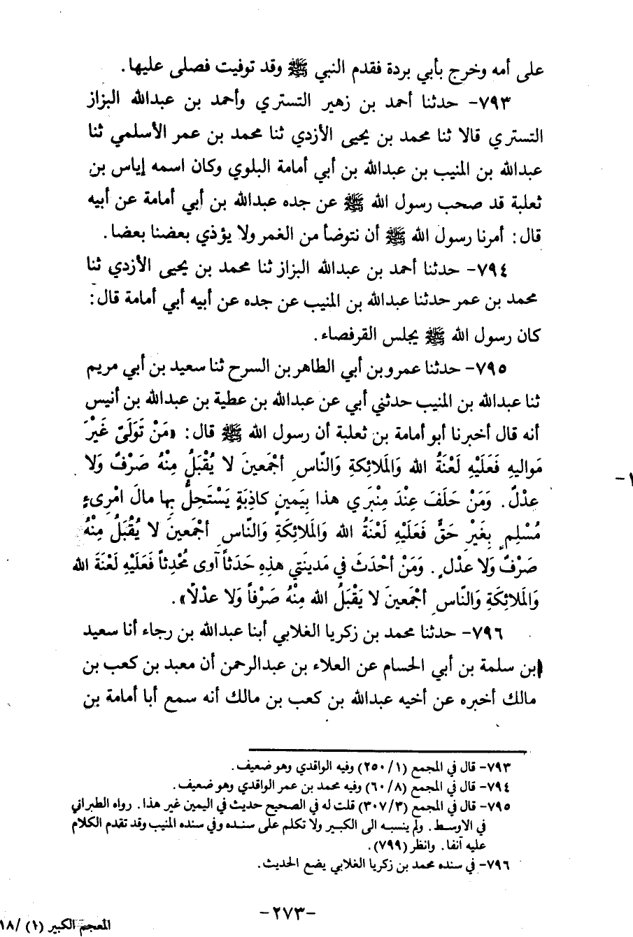 795 - حَدَّثَنَا عَمْرُو بْنُ أَبِي الطَّاهِرِ بْنِ السَّرْحِ، ثنا سَعِيدُ بْنُ أَبِي مَرْيَمَ، ثنا عَبْدُ اللهِ بْنُ الْمُنِيبِ، حَدَّثَنِي أَبِي، عَنْ عَبْدِ اللهِ بْنِ عَطِيَّةَ بْنِ عَبْدِ اللهِ بْنِ أُنَيْسٍ، أَنَّهُ قَالَ: أَخْبَرَنَا أَبُو أُمَامَةَ بْنُ ثَعْلَبَةَ، أَنَّ رَسُولَ اللهِ صَلَّى اللهُ عَلَيْهِ وَسَلَّمَ قَالَ: «§مَنْ تَوَلَّى غَيْرَ مَوَالِيهِ فَعَلَيْهِ لَعْنَةُ اللهِ وَالْمَلَائِكَةِ وَالنَّاسِ أَجْمَعِينَ، لَا يُقْبَلُ مِنْهُ صَرْفٌ وَلَا عَدْلٌ، وَمَنْ حَلَفَ عِنْدَ مِنْبَرِي هَذَا بِيَمِينٍ كَاذِبَةٍ يَسْتَحِلُّ بِهَا مَالَ امْرِئٍ مُسْلِمٍ بِغَيْرِ حَقٍّ، فَعَلَيْهِ لَعْنَةُ اللهِ، وَالْمَلَائِكَةِ، وَالنَّاسِ أَجْمَعِينَ، لَا يُقْبَلُ مِنْهُ صَرْفٌ، وَلَا عَدْلٌ، وَمَنْ أَحْدَثَ فِي مَدِينَتِي هَذِهِ حَدَثًا آوَى مُحْدِثًا، فَعَلَيْهِ لَعْنَةُ اللهِ وَالْمَلَائِكَةِ، وَالنَّاسِ أَجْمَعِينَ، لَا يَقْبَلُ اللهُ مِنْهُ صَرْفًا، وَلَا عَدْلًا»