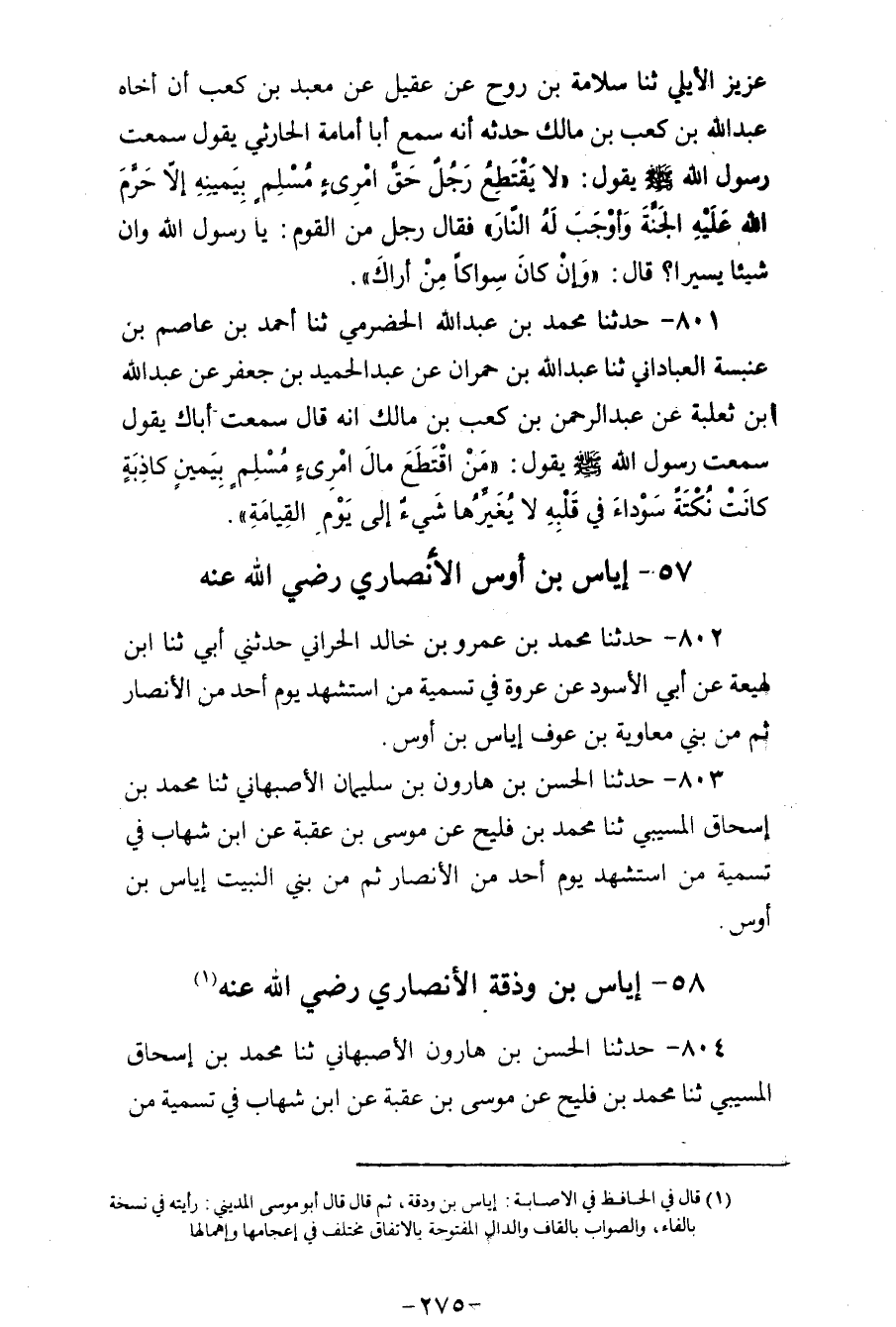 801 - حَدَّثَنَا مُحَمَّدُ بْنُ عَبْدِ اللهِ الْحَضْرَمِيُّ، ثنا أَحْمَدُ بْنُ عَاصِمِ بْنِ عَنْبَسَةَ الْعَبَّادَانِيُّ، ثنا عَبْدُ اللهِ بْنُ حُمْرَانَ، عَنْ عَبْدِ الْحَمِيدِ بْنِ جَعْفَرٍ، عَنْ عَبْدِ اللهِ بْنِ ثَعْلَبَةَ، عَنْ عَبْدِ الرَّحْمَنِ بْنِ كَعْبِ بْنِ مَالِكٍ، أَنَّهُ قَالَ: سَمِعْتُ أَبَاكَ، يَقُولُ: سَمِعْتُ رَسُولَ اللهِ صَلَّى اللهُ عَلَيْهِ وَسَلَّمَ يَقُولُ: «§مَنِ اقْتَطَعَ مَالَ امْرِئٍ مُسْلِمٍ بِيَمِينٍ كَاذِبَةٍ كَانَتِ نُكْتَةً سَوْدَاءَ فِي قَلْبِهِ، لَا يُغَيِّرُهَا شَيْءٌ إِلَى يَوْمِ الْقِيَامَةِ»