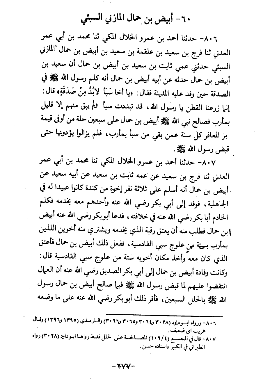 807 - حَدَّثَنَا أَحْمَدُ بْنُ عَمْرٍو الْخَلَّالُ الْمَكِّيُّ، ثنا مُحَمَّدُ بْنُ أَبِي عُمَرَ الْعَدَنِيُّ، ثنا فَرَجُ بْنُ سَعِيدٍ، عَنْ عَمِّهِ ثَابِتِ بْنِ سَعِيدٍ، عَنْ أَبِيهِ سَعِيدٍ، عَنْ أَبْيَضَ بْنِ حَمَّالٍ، أَنَّهُ أَسْلَمَ عَلَى ثَلَاثَةِ نَفَرٍ إِخْوَةٍ مِنْ كِنْدَةَ كَانُوا عَبِيدًا لَهُ فِي الْجَاهِلِيَّةِ، فَوَفَدَ إِلَى أَبِي بَكْرٍ رَضِيَ اللهُ عَنْهُ وَأَحَدُهُمْ مَعَهُ يَخْدُمُهُ، فَكَلَّمَ الْخَادِمُ أَبَا بَكْرٍ رَضِيَ اللهُ عَنْهُ فِي خِلَافَتِهِ، فَدَعَا أَبُو بَكْرٍ رَضِيَ اللهُ عَنْهُ أَبْيَضَ بْنَ حَمَّالٍ فَطَلَبَ مِنْهُ أَنْ يَعْتِقَ رَقَبَةَ الَّذِي يَخْدُمُهُ، وَيَشْتَرِيَ مِنْهُ أَخَوَيْنِ اللَّذَيْنِ بِمَأْرِبَ بِسِتَّةٍ مِنْ عُلُوجِ سَبْيِ الْقَادِسِيَّةِ، فَفَعَلَ ذَلِكَ أَبْيَضُ بْنُ حَمَّالٍ، فَأَعْتَقَ الَّذِي كَانَ مَعَهُ وَأَخَذَ مَكَانَ أَخَوَيْهِ سِتَّةً مِنْ عُلُوجِ سَبْيِ الْقَادِسِيَّةِ، قَالَ: وَكَانَتْ وِفَادَةُ أَبْيَضَ بْنِ حَمَّالٍ إِلَى أَبِي بَكْرٍ الصِّدِّيقِ رَضِيَ اللهُ عَنْهُ أَنَّ الْعُمَّالَ انْتَقَضُوا عَلَيْهِمْ لَمَّا قُبِضَ رَسُولُ اللهِ صَلَّى اللهُ عَلَيْهِ وَسَلَّمَ فِيمَا «§صَالَحَ أَبْيَضُ بْنُ حَمَّالٍ رَسُولَ اللهِ صَلَّى اللهُ عَلَيْهِ وَسَلَّمَ بِالْحُلَلِ السَّبْعِينَ» فَأَقَرَّ ذَلِكَ أَبُو بَكْرٍ رَضِيَ اللهُ عَنْهُ عَلَى مَا وَضَعَهُ رَسُولُ اللهِ صَلَّى اللهُ عَلَيْهِ وَسَلَّمَ حَتَّى مَاتَ أَبُو بَكْرٍ، فَلَمَّا مَاتَ أَبُو بَكْرٍ انْتُقِضَ ذَلِكَ وَصَارَ عَلَى الصَّدَقَةِ