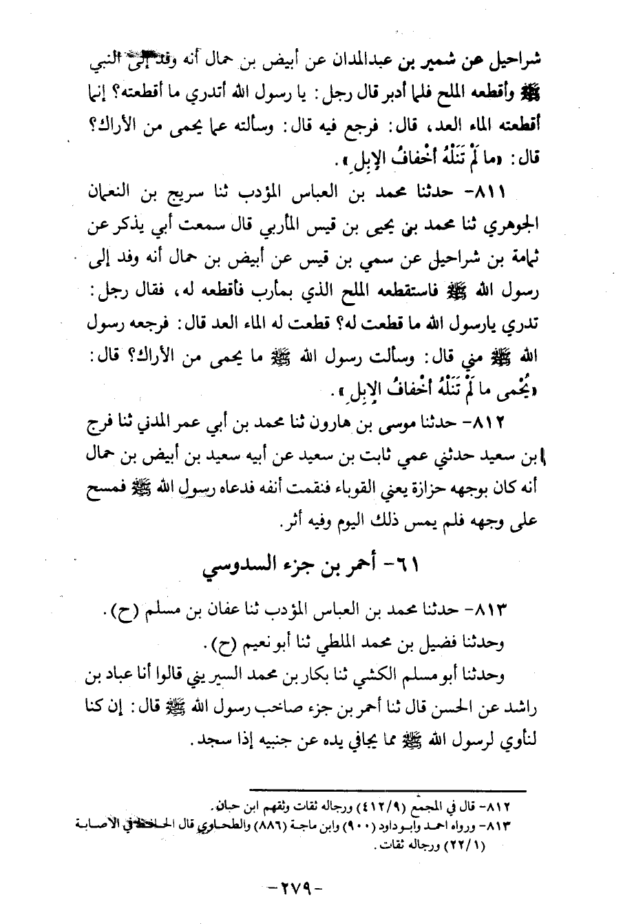 811 - حَدَّثَنَا مُحَمَّدُ بْنُ الْعَبَّاسِ الْمُؤَدِّبُ، ثنا سُرَيْجُ بْنُ النُّعْمَانِ الْجَوْهَرِيُّ، ثنا مُحَمَّدُ بْنُ يَحْيَى بْنِ قَيْسٍ الْمَأْرِبِيُّ، قَالَ: سَمِعْتُ أَبِي يَذْكُرُ، عَنْ ثُمَامَةَ بْنِ شَرَاحِيلَ، عَنْ سُمَيِّ بْنِ قَيْسٍ، عَنْ أَبْيَضَ بْنِ حَمَّالٍ، أَنَّهُ وَفَدَ إِلَى رَسُولِ اللهِ صَلَّى اللهُ عَلَيْهِ وَسَلَّمَ فَاسْتَقْطَعَهُ الْمِلْحَ الَّذِي بِمَأْرِبَ، فَأَقْطَعَهُ لَهُ، فَقَالَ رَجُلٌ: تَدْرِي يَا رَسُولَ اللهِ مَا قَطَعْتَ لَهُ؟ قَطَعْتَ لَهُ الْمَاءَ الْعِدَّ، قَالَ: فَرَّجَعَهُ رَسُولُ اللهِ صَلَّى اللهُ عَلَيْهِ وَسَلَّمَ مِنِّي، قَالَ: وَسَأَلْتُ رَسُولَ اللهِ صَلَّى اللهُ عَلَيْهِ وَسَلَّمَ §مَا يُحْمَى مِنَ الْأَرَاكِ؟ قَالَ: «يُحْمَى مَا لَمْ تَنَلْهُ أَخْفَافُ الْإِبِلِ»