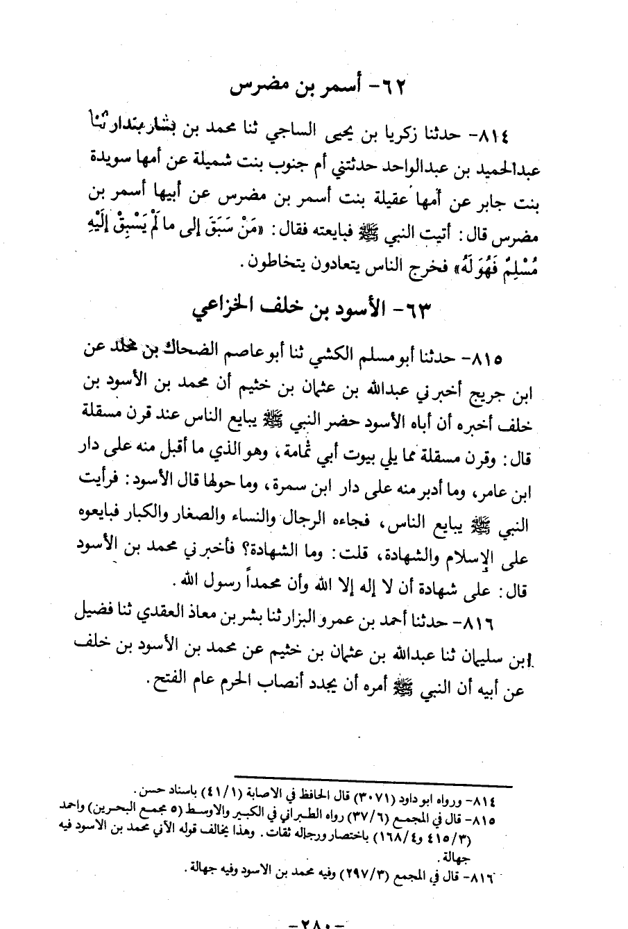 815 - حَدَّثَنَا أَبُو مُسْلِمٍ الْكَشِّيُّ، ثنا أَبُو عَاصِمٍ الضَّحَّاكُ بْنُ مَخْلَدٍ، عَنِ ابْنِ جُرَيْجٍ، أَخْبَرَنِي عَبْدُ اللهِ بْنُ عُثْمَانَ بْنِ خُثَيْمٍ، أَنَّ مُحَمَّدَ بْنَ الْأَسْوَدِ بْنِ خَلَفٍ أَخْبَرَهُ، أَنَّ أَبَاهُ الْأَسْوَدَ، حَضَرَ النَّبِيَّ صَلَّى اللهُ عَلَيْهِ وَسَلَّمَ يُبَايِعُ النَّاسَ عِنْدَ قَرْنِ مَسْقَلَةَ - قَالَ: وَقَرْنُ مَسْقَلَةَ مِمَّا يَلِي بُيُوتَ أَبِي ثُمَامَةَ، وَهُوَ الَّذِي مَا أَقْبَلَ مِنْهُ عَلَى دَارِ ابْنِ عَامِرٍ، وَمَا أَدْبَرَ مِنْهُ عَلَى دَارِ ابْنِ سَمُرَةَ وَمَا حَوْلَهَا - قَالَ الْأَسْوَدُ: «فَرَأَيْتُ النَّبِيَّ صَلَّى اللهُ عَلَيْهِ وَسَلَّمَ §يُبَايِعُ النَّاسَ، فَجَاءَهُ الرِّجَالُ وَالنِّسَاءُ وَالصَّغَارُ وَالْكِبَارُ فَبَايَعُوهُ عَلَى الْإِسْلَامِ وَالشَّهَادَةِ» قُلْتُ: وَمَا الشَّهَادَةُ؟ فَأَخْبَرَنِي مُحَمَّدُ بْنُ الْأَسْوَدِ قَالَ: «عَلَى شَهَادَةِ أَنْ لَا إِلَهَ إِلَّا اللهُ، وَأَنَّ مُحَمَّدًا رَسُولُ اللهِ»