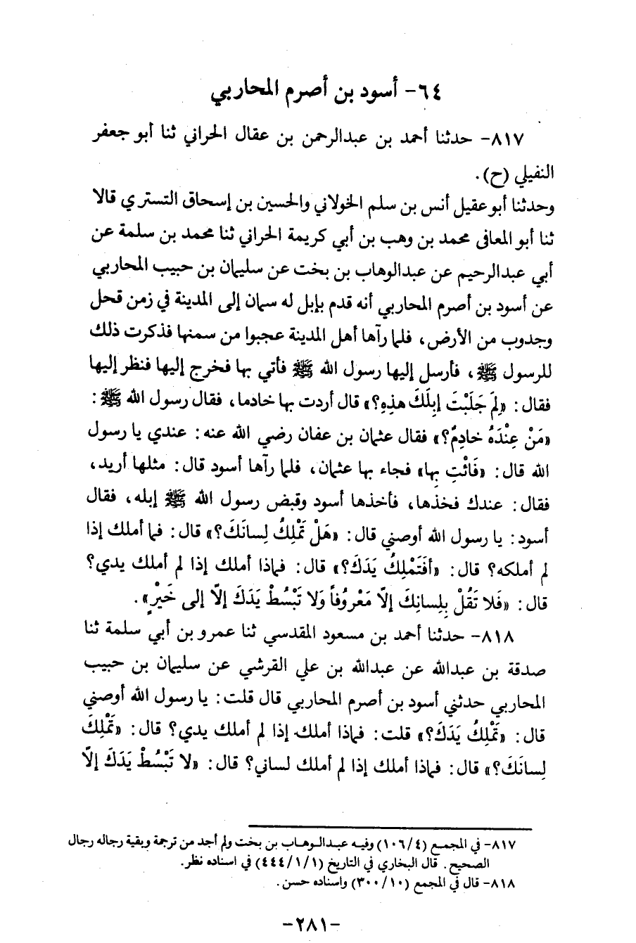 817 - حَدَّثَنَا أَحْمَدُ بْنُ عَبْدِ الرَّحْمَنِ بْنِ عِقَالٍ الْحَرَّانِيُّ، ثنا أَبُو جَعْفَرٍ النُّفَيْلِيُّ، ح وَحَدَّثَنَا أَبُو عَقِيلٍ أَنَسُ بْنُ سَلْمٍ الْخَوْلَانِيُّ، وَالْحُسَيْنُ بْنُ إِسْحَاقَ التُّسْتَرِيُّ، قَالَا: ثنا أَبُو الْمُعَافَى مُحَمَّدُ بْنُ وَهْبِ بْنِ أَبِي كَرِيمَةَ الْحَرَّانِيُّ، ثنا مُحَمَّدُ بْنُ سَلَمَةَ، عَنْ أَبِي عَبْدِ الرَّحِيمِ، عَنْ عَبْدِ الْوَهَّابِ بْنِ بُخْتٍ، عَنْ سُلَيْمَانَ بْنِ حَبِيبٍ الْمُحَارِبِيِّ، عَنْ أَسْوَدَ بْنِ أَصْرَمَ الْمُحَارِبِيِّ، أَنَّهُ قَدِمَ بِإِبِلٍ لَهُ سِمَانٍ إِلَى الْمَدِينَةِ فِي زَمَنٍ قَحْلٍ وَجَدُوبٍ مِنَ الْأَرْضِ، فَلَمَّا رَآهَا أَهْلُ الْمَدِينَةِ عَجِبُوا مِنْ سِمَنِهَا، فَذَكَرْتُ ذَلِكَ لِلرَّسُولِ صَلَّى اللهُ عَلَيْهِ وَسَلَّمَ، فَأَرْسَلَ إِلَيْهَا رَسُولُ اللهِ صَلَّى اللهُ عَلَيْهِ وَسَلَّمَ فَأُتِيَ بِهَا، فَخَرَجَ إِلَيْهَا، فَنَظَرَ إِلَيْهَا، فَقَالَ: «لِمَ جَلَبْتَ إِبِلَكَ هَذِهِ؟» قَالَ: أَرَدْتُ بِهَا خَادِمًا، فَقَالَ رَسُولُ اللهِ صَلَّى اللهُ عَلَيْهِ وَسَلَّمَ: «مَنْ عِنْدَهَ خَادِمٌ؟» فَقَالَ عُثْمَانُ بْنُ عَفَّانَ رَضِيَ اللهُ عَنْهُ: عِنْدِي يَا رَسُولَ اللهِ، قَالَ: «فَائْتِ بِهَا» فَجَاءَ بِهَا عُثْمَانُ فَلَمَّا رَآهَا أَسْوَدُ قَالَ: مِثْلَهَا أُرِيدُ، فَقَالَ: «عِنْدَكَ فَخُذْهَا» فَأَخَذَهَا أَسْوَدُ وَقَبَضَ رَسُولُ اللهِ صَلَّى اللهُ عَلَيْهِ وَسَلَّمَ إِبِلَهُ، فَقَالَ أَسْوَدُ: يَا رَسُولَ اللهِ، أَوْصِنِي، قَالَ: «هَلْ تَمْلِكُ لِسَانَكَ؟» قَالَ: فَمَا أَمْلِكُ إِذَا لَمْ أَمْلِكْهُ؟ قَالَ: «أَفَتَمْلِكُ يَدَكَ؟» قَالَ: فَمَاذَا أَمْلِكُ إِذَا لَمْ أَمْلِكْ يَدِي؟ قَالَ: «§فَلَا تَقُلْ بِلِسَانِكَ إِلَّا مَعْرُوفًا، وَلَا تَبْسُطْ يَدَكَ إِلَّا إِلَى خَيْرٍ»