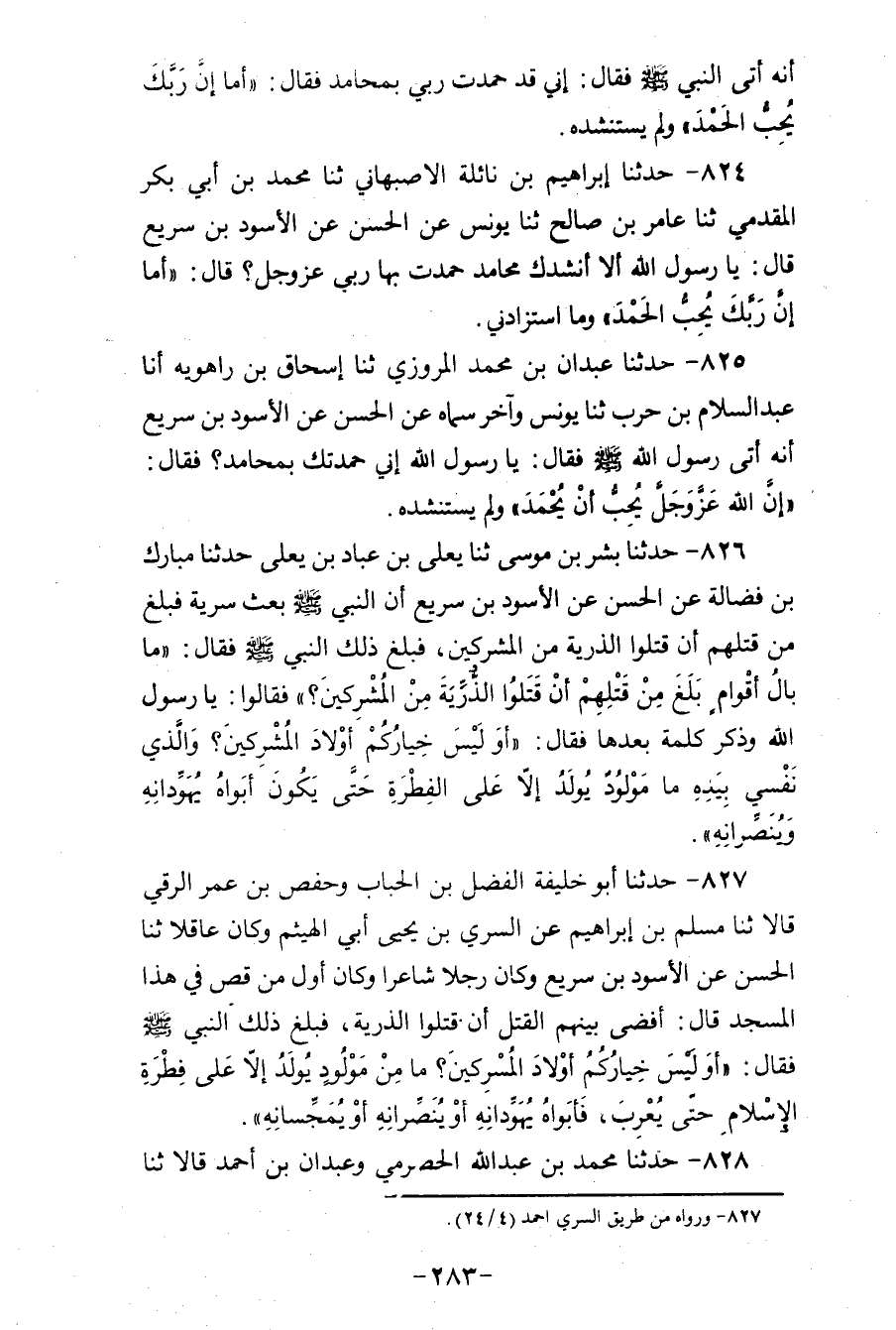 827 - حَدَّثَنَا أَبُو خَلِيفَةَ الْفَضْلُ بْنُ الْحُبَابِ، وَحَفْصُ بْنُ عُمَرَ الرَّقِّيُّ، قَالَا: ثنا مُسْلِمُ بْنُ إِبْرَاهِيمَ، عَنِ السَّرِيِّ بْنِ يَحْيَى أَبِي الْهَيْثَمِ، وَكَانَ عَاقِلًا، ثنا الْحَسَنُ، عَنِ الْأَسْوَدِ بْنِ سَرِيعٍ، وَكَانَ رَجُلًا شَاعِرًا، وَكَانَ أَوَّلَ مَنْ قَصَّ فِي هَذَا الْمَسْجِدِ، قَالَ: أَفْضَى بَيْنَهُمُ الْقَتْلُ أَنْ قَتَلُوا الذُّرِّيَّةَ، فَبَلَغَ ذَلِكَ النَّبِيَّ صَلَّى اللهُ عَلَيْهِ وَسَلَّمَ، فَقَالَ: «أَوَلَيْسَ خِيَارُكُمْ أَوْلَادَ الْمُشْرِكِينَ §مَا مِنْ مَوْلُودٍ يُولَدُ إِلَّا عَلَى فِطْرَةِ الْإِسْلَامِ، حَتَّى يُعْرِبَ فَأَبَوَاهُ يُهَوِّدَانِهِ، أَوْ يُنَصِّرَانِهِ، أَوْ يُمَجِّسَانِهِ»