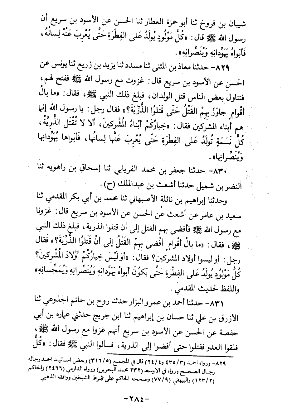 831 - حَدَّثَنَا أَحْمَدُ بْنُ عَمْرٍو الْبَزَّارُ، حَدَّثَنَا رَوْحُ بْنُ حَاتِمٍ الْجُذُوعِيُّ، ثنا الْأَزْرَقُ بْنُ عَلِيٍّ، ثنا حَسَّانُ بْنُ إِبْرَاهِيمَ، ثنا ابْنُ جُرَيْجٍ، حَدَّثَنِي عُمَارَةُ بْنُ أَبِي حَفْصَةَ، عَنِ الْحَسَنِ، عَنِ الْأَسْوَدِ بْنِ سَرِيعٍ، أَنَّهُمْ غَزَوْا مَعَ رَسُولِ اللهِ صَلَّى اللهُ عَلَيْهِ وَسَلَّمَ فَلَقُوا الْعَدُوَّ، فَقَتَلُوا حَتَّى أَفْضَوْا إِلَى الذُّرِّيَّةِ، فَسَأَلُوا النَّبِيَّ صَلَّى اللهُ عَلَيْهِ وَسَلَّمَ، فَقَالَ: «§كُلُّ مَوْلُودٍ عَلَى الْفِطْرَةِ حَتَّى يَكُونَ أَبَوَاهُ يُهَوِّدَانِهِ وَيُنَصِّرَانِهِ»