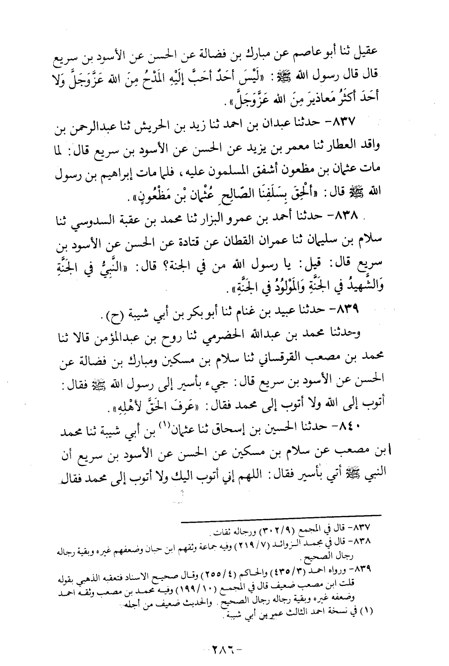 839 - حَدَّثَنَا عُبَيْدُ بْنُ غَنَّامٍ، ثنا أَبُو بَكْرِ بْنُ أَبِي شَيْبَةَ، ح وَحَدَّثَنَا مُحَمَّدُ بْنُ عَبْدِ اللهِ الْحَضْرَمِيُّ، ثنا رَوْحُ بْنُ عَبْدِ الْمُؤْمِنِ، قَالَا: ثنا مُحَمَّدُ بْنُ مُصْعَبٍ الْقَرْقَسَانِيُّ، ثنا سَلَّامُ بْنُ مِسْكِينٍ، وَمُبَارَكُ بْنُ فَضَالَةَ، عَنِ الْحَسَنِ، عَنِ الْأَسْوَدِ بْنِ سَرِيعٍ، قَالَ: جِيءَ بِأَسِيرٍ إِلَى رَسُولِ اللهِ صَلَّى اللهُ عَلَيْهِ وَسَلَّمَ، فَقَالَ: أَتُوبُ إِلَى اللهِ، وَلَا أَتُوبُ إِلَى مُحَمَّدٍ، فَقَالَ: «§عَرَفَ الْحَقَّ لِأَهْلِهِ»
