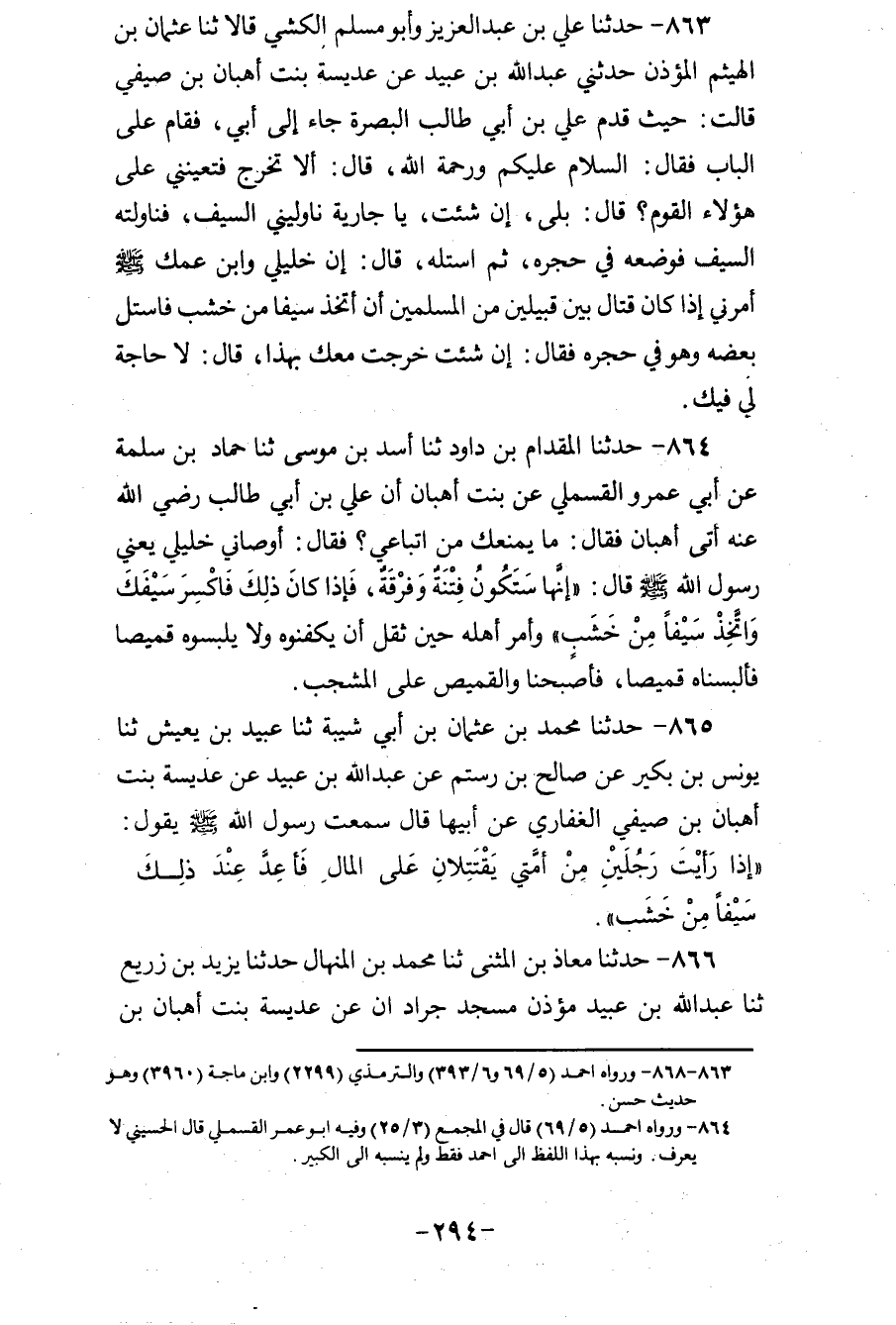 865 - حَدَّثَنَا مُحَمَّدُ بْنُ عُثْمَانَ بْنِ أَبِي شَيْبَةَ، ثنا عُبَيْدُ بْنُ يَعِيشَ، ثنا يُونُسُ بْنُ بُكَيْرٍ، عَنْ صَالِحِ بْنِ رُسْتُمَ، عَنْ عَبْدِ اللهِ بْنِ عُبَيْدٍ، عَنْ عُدَيْسَةَ بِنْتِ أُهْبَانَ بْنِ صَيْفِيٍّ الْغِفَارِيِّ، عَنْ أَبِيهَا، قَالَ: سَمِعْتُ رَسُولَ اللهِ صَلَّى اللهُ عَلَيْهِ وَسَلَّمَ يَقُولُ: «§إِذَا رَأَيْتَ رَجُلَيْنِ مِنْ أُمَّتِي يَقْتَتِلَانِ عَلَى الْمَالِ، فَأَعِدَّ عِنْدَ ذَلِكَ سَيْفًا مِنْ خَشَبٍ»