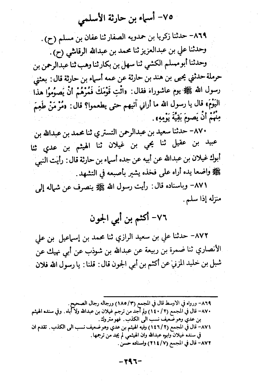 869 - حَدَّثَنَا زَكَرِيَّا بْنُ حَمْدَوَيْهِ الصَّفَّارُ، ثنا عَفَّانُ بْنُ مُسْلِمٍ، ح وَحَدَّثَنَا عَلِيُّ بْنُ عَبْدِ الْعَزِيزِ، ثنا مُحَمَّدُ بْنُ عَبْدِ اللهِ الرَّقَاشِيُّ، ح وَحَدَّثَنَا أَبُو مُسْلِمٍ الْكَشِّيُّ، ثنا سَهْلُ بْنُ بَكَّارٍ، ثنا وَهْبٌ، ثنا عَبْدُ الرَّحْمَنِ بْنُ حَرْمَلَةَ، حَدَّثَنِي يَحْيَى بْنُ هِنْدَ بْنِ حَارِثَةَ، عَنْ عَمِّهِ أَسْمَاءَ بْنِ حَارِثَةَ، قَالَ: بَعَثَنِي رَسُولُ اللهِ صَلَّى اللهُ عَلَيْهِ وَسَلَّمَ يَوْمَ عَاشُورَاءَ، فَقَالَ: «ائْتِ قَوْمَكَ §فَمُرْهُمْ أَنْ يَصُومُوا هَذَا الْيَوْمَ» قَالَ: يَا رَسُولَ اللهِ، مَا أُرَانِي آتِيهِمْ حَتَّى يَطْعَمُوا، قَالَ: «مُرْ مَنْ طَعِمَ مِنْهُمْ أَنْ يَصُومَ بَقِيَّةَ يَوْمِهِ»